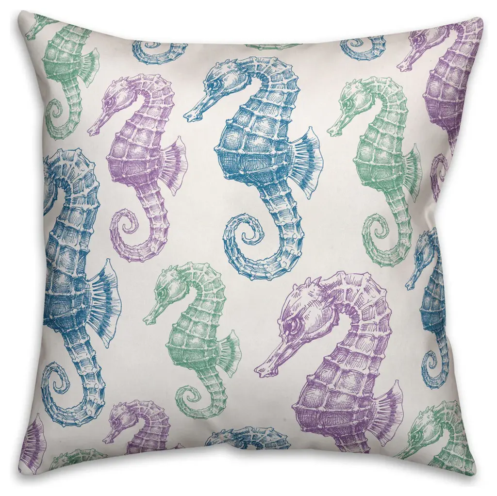 Spruce up your outdoor seating with this coastal outdoor throw pillow, featuring a pastel seahorse pattern. The water and mildew resistant heavy weight stretch material provides great color definition and quality. The result is a unique pillow that is sure to add some personality to your outdoor living space!