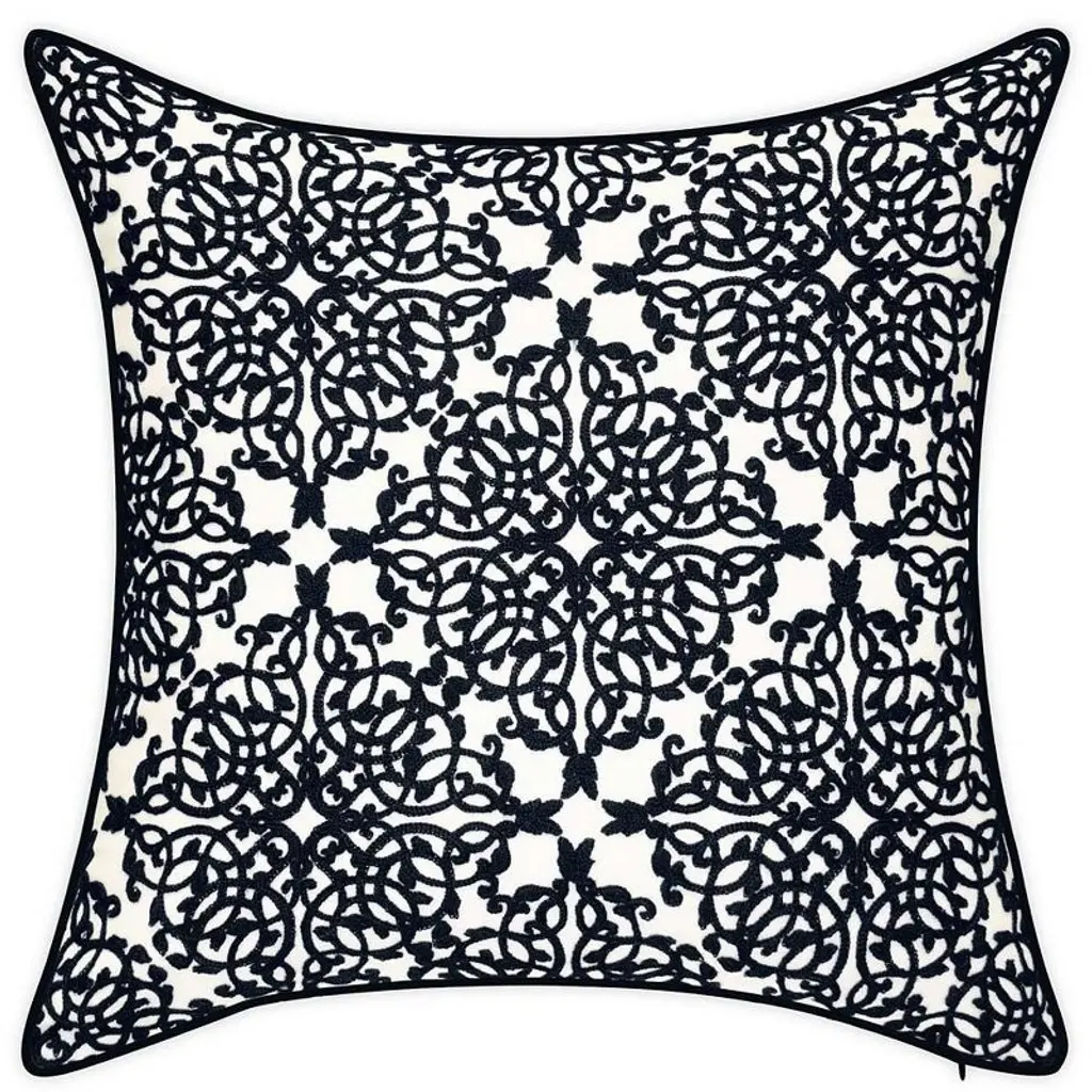 This Pawn Vanilla Pillow brings classic elegance with its scrollwork velvet design on off white woven fabric. The scrollwork pattern is continued on all the 4 seamed sides of the pillow.Details:PolyesterPolyester lining inside.Bottom zipper closure.Feather/down insert.Dry clean.Handmade in the USA.