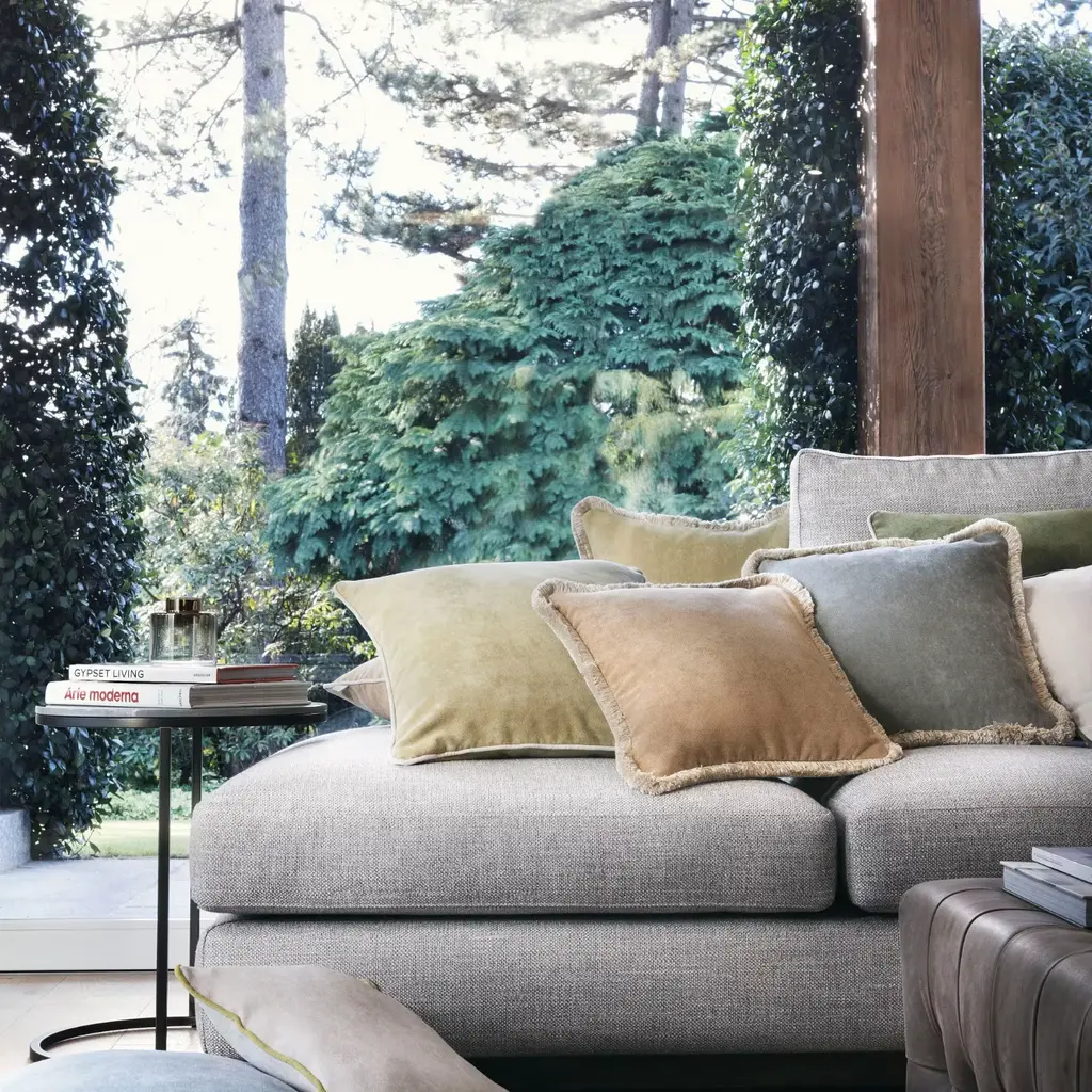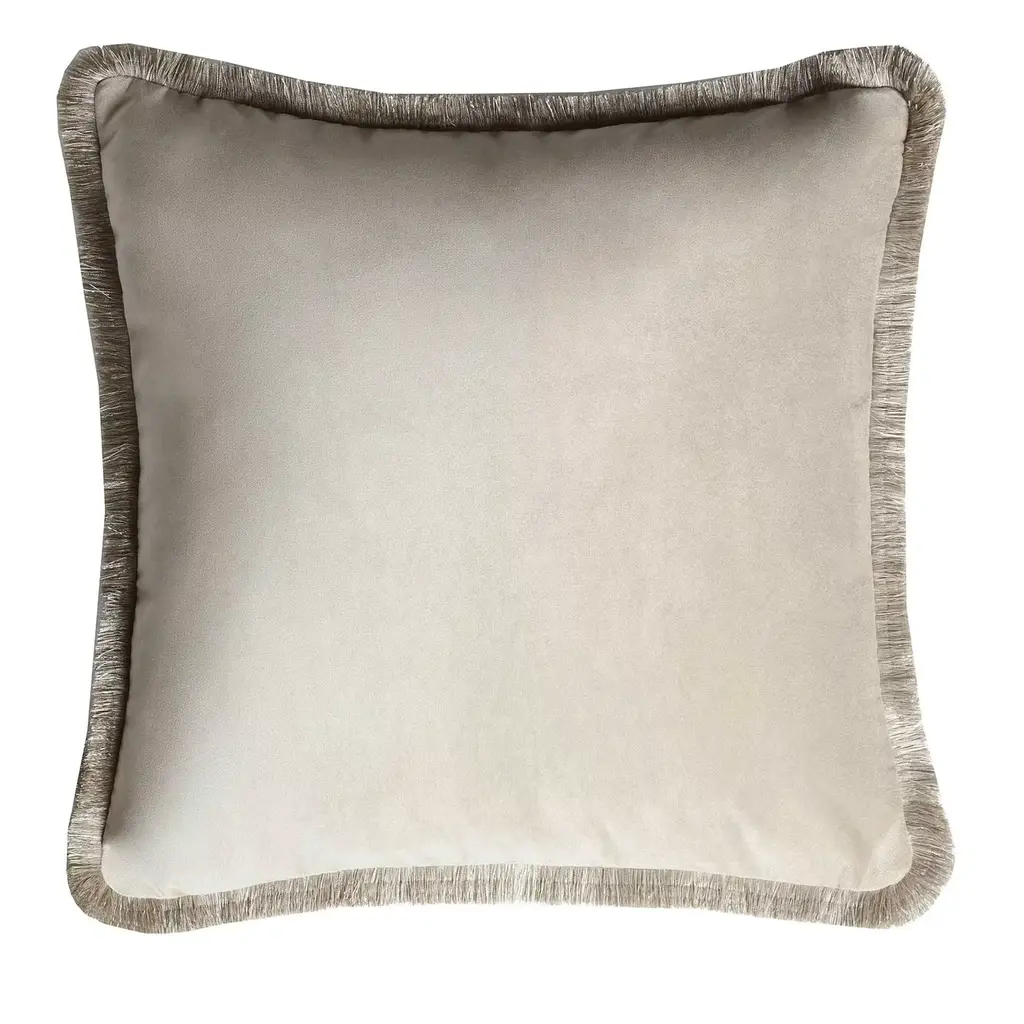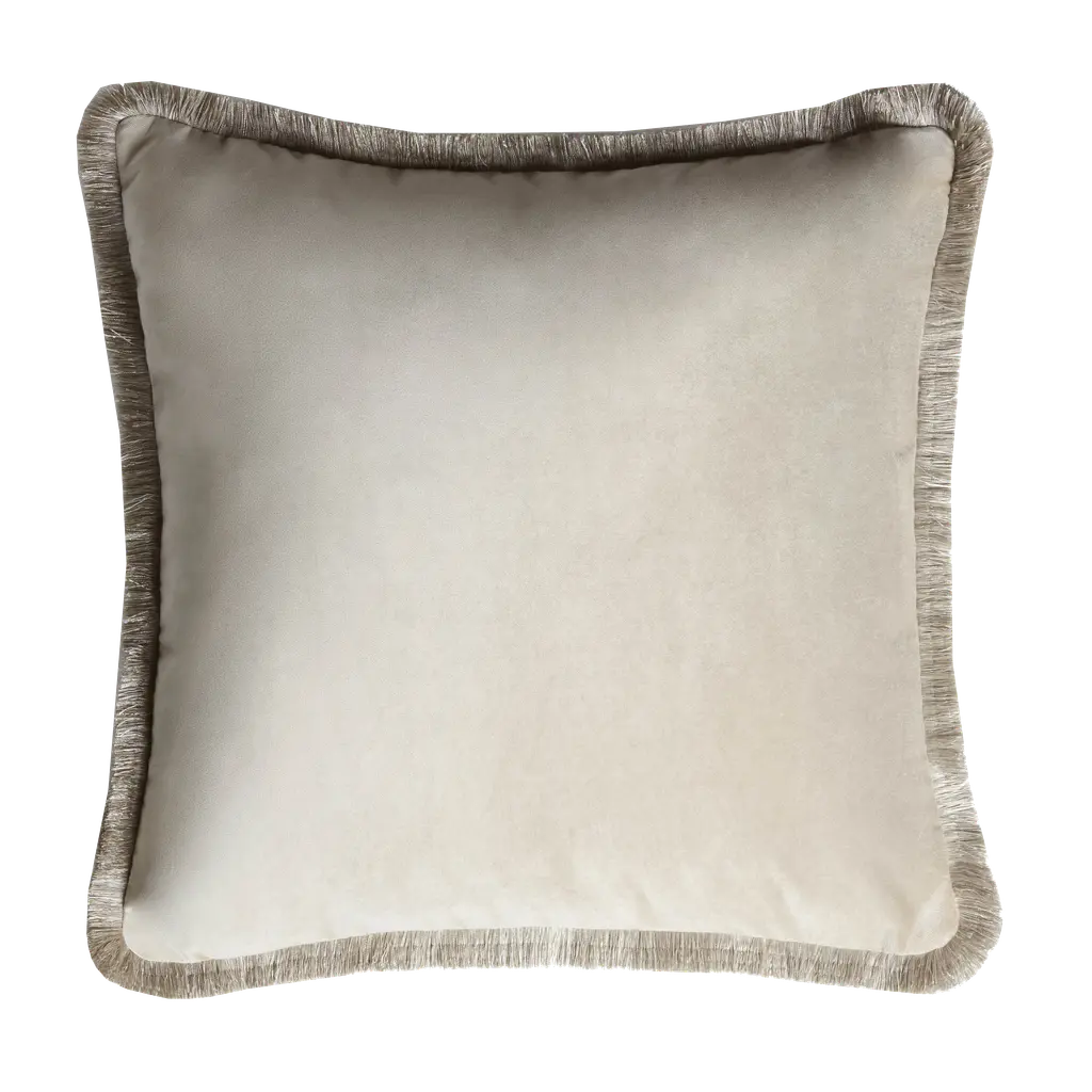 This elegant cushion from the Happy Pillow Collection is a romantic accent piece, that will make a glamorous statement in any interior decor. The antique-pearl hue of its removable velvet cover combines with the bold border of dirty white cotton trimming outlining its square silhouette. Padded with soft polyester fiber, this cushion is a mesmerizing example of Lo Decor's excellent quality standards.Removable and washable pillow cases with a stuffing. Pearl with dirty white fringe 40X40cm