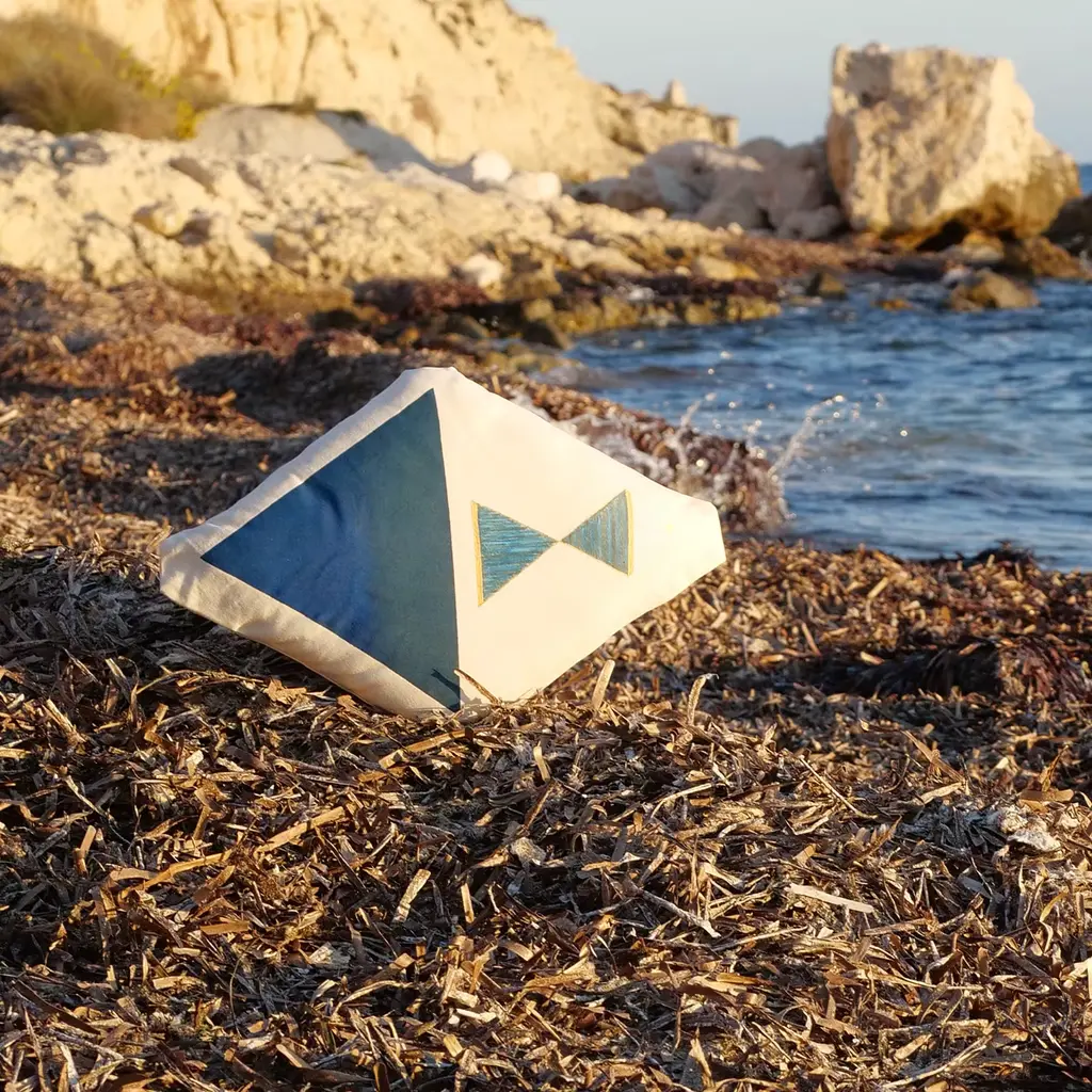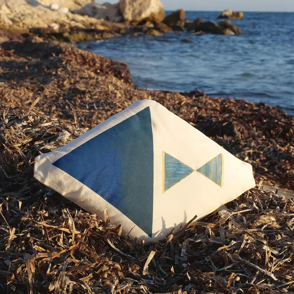 A poetic design offering comfort while surprising with its artistic value, this artisan cushion flaunts an artful rhomboidal shape, with a cover in a cotton-blend wrapped around generous inner padding. A stylized blue fish accented with golden details is hand-painted on half of the cover, juxtaposed to a blue triangle standing oppositely. Completed by a lateral zip closure, it should be only washed manually. Do not add softener or use bleach.