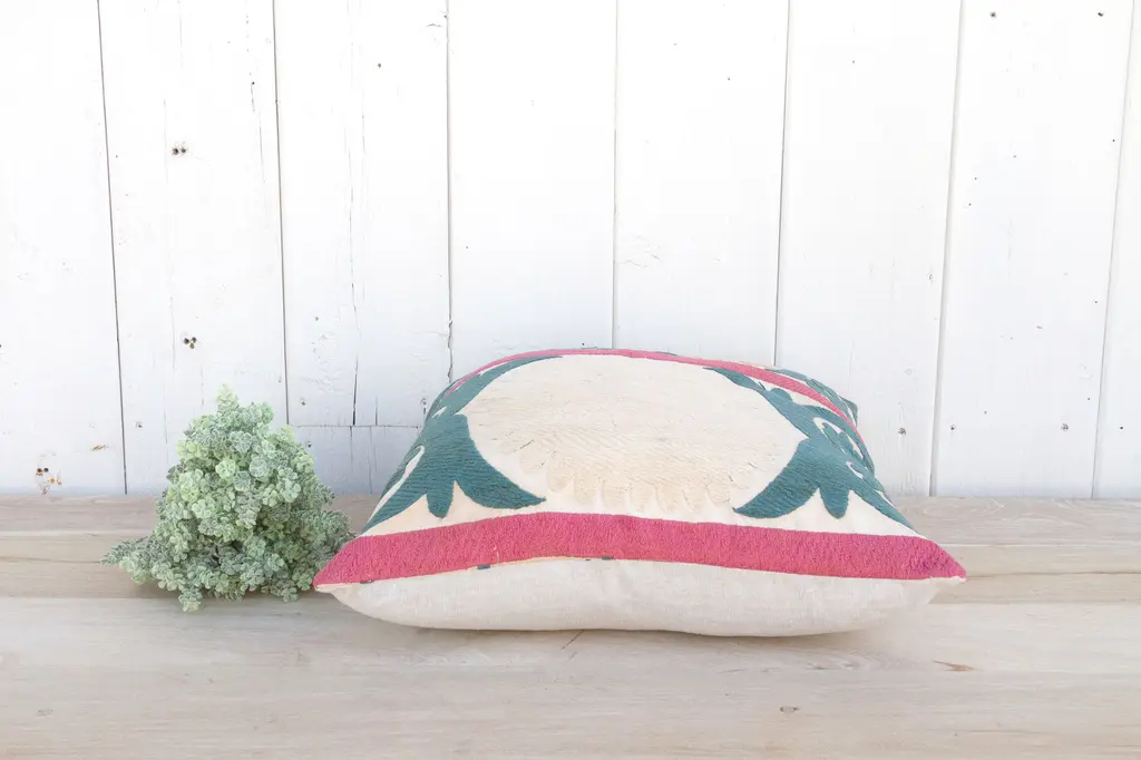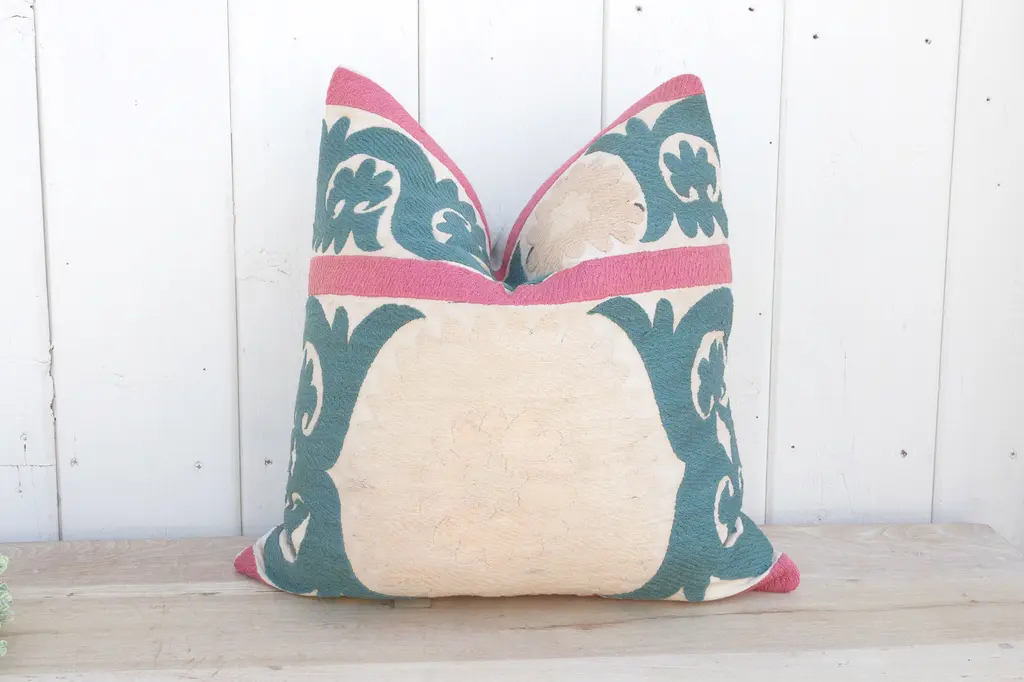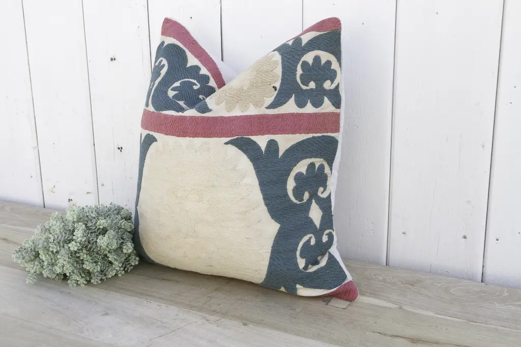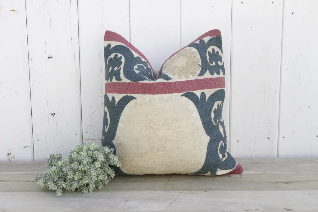 Our collection of Suzani tapestries have been repurposed and made into one of a kind pillows featuring beautiful hand done embroidery, with colorful thread work in a variety of flowers, leaves & vines motif. This Suzani bohemian pillow has been reimagined for today’s interiors with a modern linen backing and hidden zipper closure. Add this antique Suzani pillow to create a globally-inspired look or to add charm and color into any room. Pillow comes with a custom down blend filler included.
