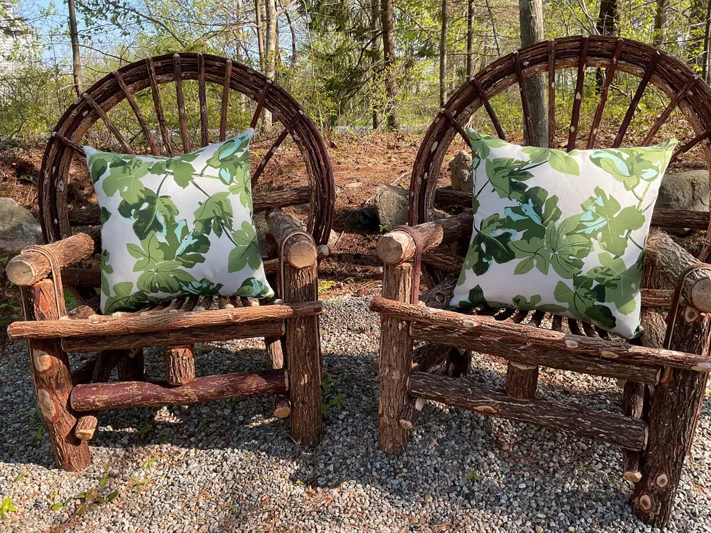 So as seen in pic 4, these are my new favorite and are in my yard! Wonderful iconic pattern from Peter Dunham-great inside or out. Lively green on white linen background with touches of aqua. Fig Leaf was created by Peter with the memories of his childhood summers spent in Spain. There, fig groves surrounded him and his nearest neighbor, Salvador’s Dali, whose home was also an inspiration. This outdoor print is soil resistant, oil and water repellent, with Teflon finishing. This listing is for one pair, 22”, covered front in Peter Dunham Fig and backed in white sunbrella. Inserts will be generous down. (Note-if intended for outdoor use, we recommend craft inserts rather than down. We can supppy also.) closure will be by way of invisible zipper.