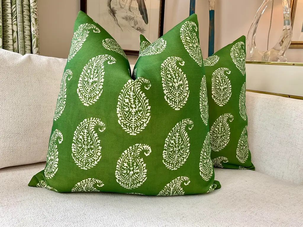 Fabulous and classic green paisley from style icon, Peter Dunham. This outdoor print is soil resistant, oil and water repellent, with Teflon coating. This listing is for a pair(2) down filled pillows measuring 22” each. Should you decide to use these outdoors, I would recommend using a foam insert. These will be backed in a coordinating off white sunbrella linen and closure will be by way of invisible zipper.
