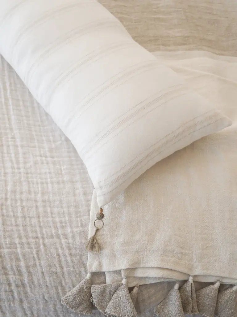 The Petite Beige Stripe Linen Pillow is Soo soft- you won’t believe it's linen! Size: 13"x30" DetailsFront & Back Color: WhiteEmbroidery: Natural BeigeTrim Details: Natural BeigeFront & Back side: 100% Linen (Pre-washed)Concealed zipper closure on back side.Spot Clean. Made in India Pillows are available in 3 options:Pillow Cover Only, with a Down Alternative insert, or with a Down InsertDown Alternative InsertBenefits: Allergen free, Better back support, Retain their shapeInside Fill: 1.2 denier x1.25" polyester gelOuter Shell: 65% polyester/ 35% white cotton blendMade in the USA Down InsertBenefits: Durable, Easy to fluff and re-style, Retains heatInside Fill: 95% gray duck feathers and 5% goose downOuter Shell: 233-thread count 100% cotton fabric Made in the USA