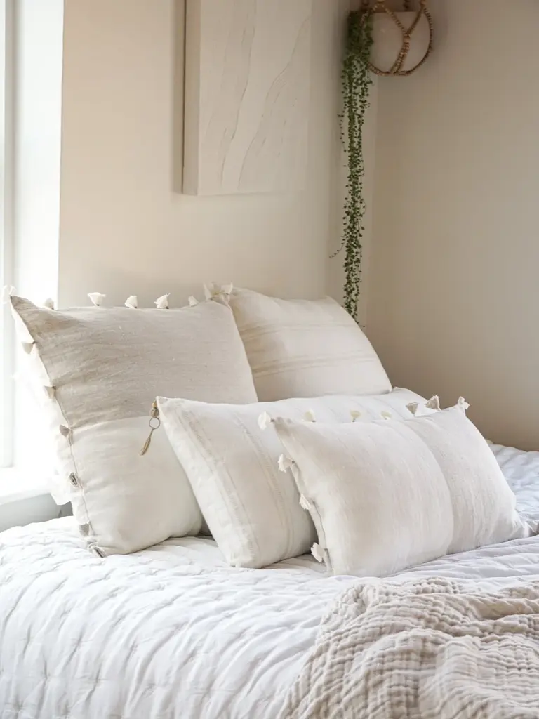 The Petite Beige Stripe Linen Pillow is Soo soft- you won’t believe it's linen! Size: 13"x30" DetailsFront & Back Color: WhiteEmbroidery: Natural BeigeTrim Details: Natural BeigeFront & Back side: 100% Linen (Pre-washed)Concealed zipper closure on back side.Spot Clean. Made in India Pillows are available in 3 options:Pillow Cover Only, with a Down Alternative insert, or with a Down InsertDown Alternative InsertBenefits: Allergen free, Better back support, Retain their shapeInside Fill: 1.2 denier x1.25" polyester gelOuter Shell: 65% polyester/ 35% white cotton blendMade in the USA Down InsertBenefits: Durable, Easy to fluff and re-style, Retains heatInside Fill: 95% gray duck feathers and 5% goose downOuter Shell: 233-thread count 100% cotton fabric Made in the USA