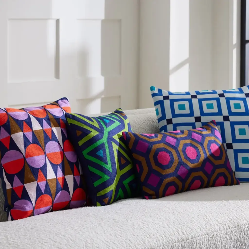 Electric Color.An electric burst of color and pattern, our Piccadilly pillows are strong statement-making gems on any sofa, chair, or bedscape. Chain-stitched by hand for a smooth texture you can cozy up to. Eye-catching accent pillows on their own, they can also be styled together for an unexpected, kaleidoscopic ‘scape.