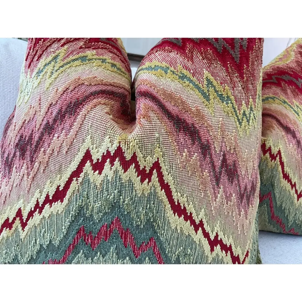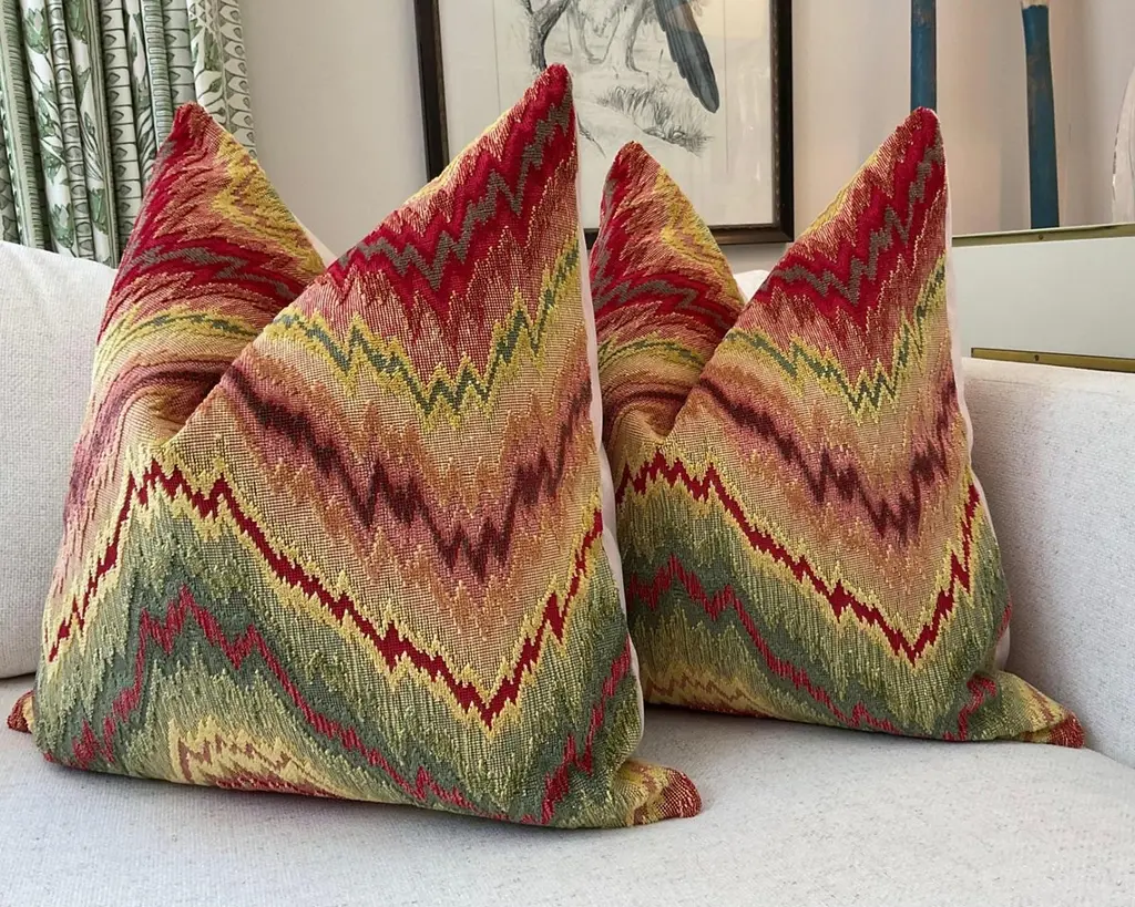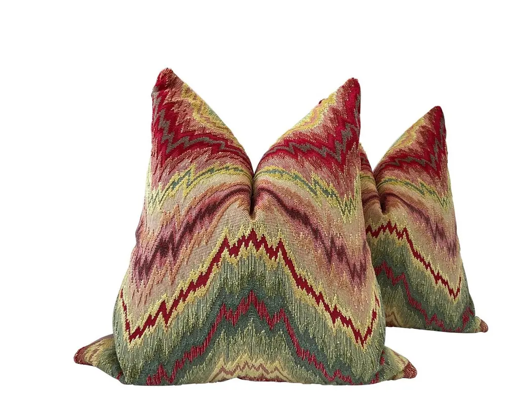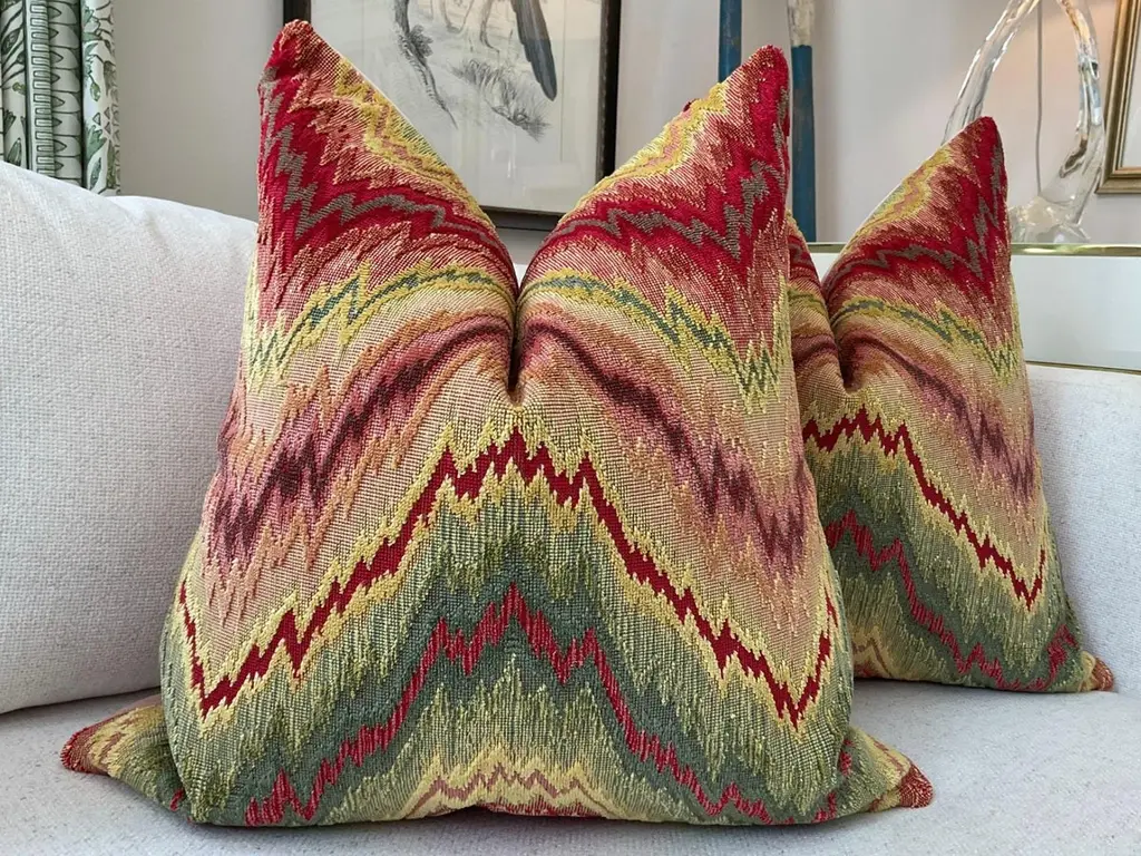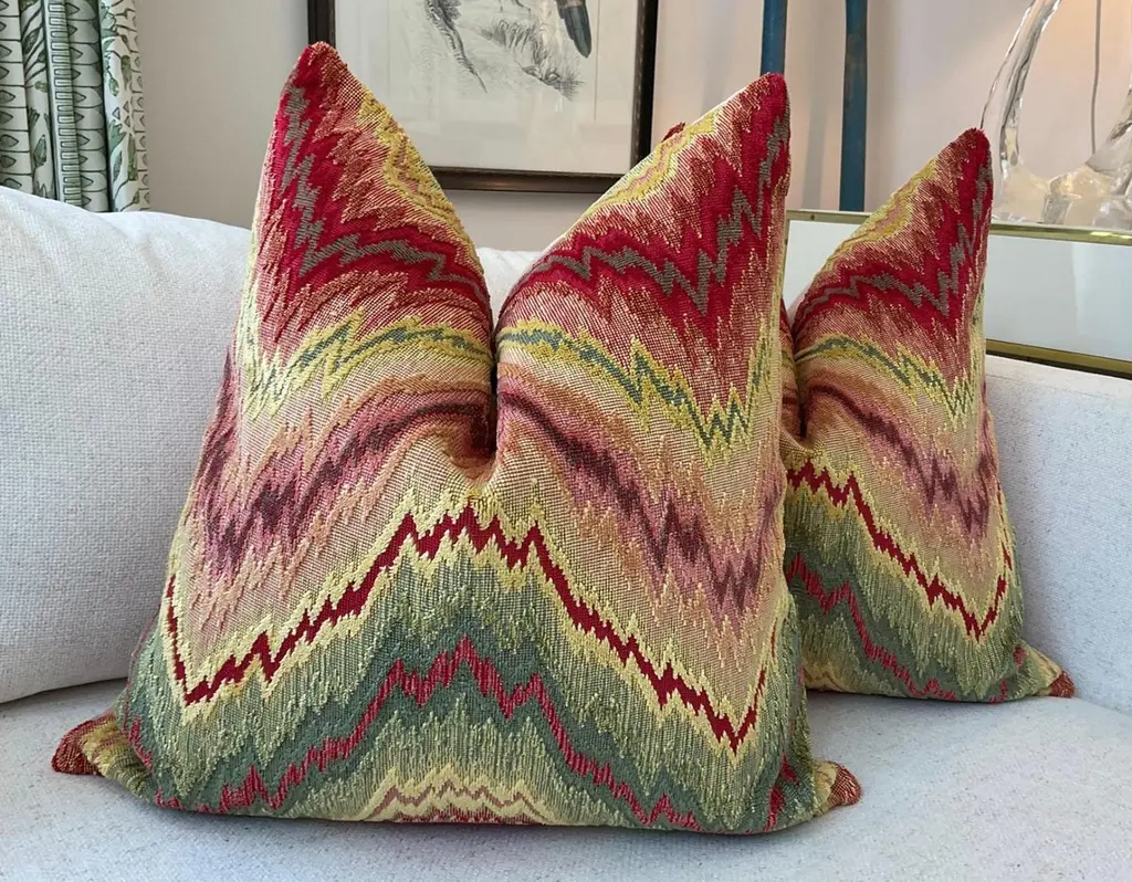 Magnificent carved velvet with a dominant linen pattern of Hungarian stitch, characteristic of the 17th century.Fabulous woven pattern. For those interested, A Hungarian stitch is one of the oldest needlepoint techniques and employs three long stitches combined with two shorter ones to deliver, roughly, a diamond-shaped result. Shades of rose, red, green, yellow….very intricate in carved velvet. The end pattern gives a Missoni-inspired reinvented flame stitch of sorts.As an aside, this is by far the most costly fabric in my inventory. I feel somewhat compelled (but not too much) to apologize for the pricing. But recently through an odd set of events, I found myself in a factory on the border of Belgium and France. Pierre Frey fabrics (and some being crafted for The Orient Express) were on their looms and I was captivated. Pricey…for sure…..worth it…no question.This listing is for a pair of plush down-filled pillows. They will be crafted using Pierre Frey Budapest in Carmine on the front. The back will be a complementary plush blush rose velvet. Closure will be by way of an invisible zipper.About UsAt Accent Marks, each designer pillow is crafted with care using the finest hand-selected fabrics and trims, paired with durable, discreet invisible zippers. We specialize in creating beautiful, high-quality pieces that elevate your home decor. While most of our listings feature 22" pillow pairs, we also offer a range of sizes and single pillow options to suit your needs. All of our Accent Marks pillows are proudly made in the United States.If you don't see the fabric you're searching for, please reach out via message as we have other fabrics available upon request and can create anything that you like. Thank you for visiting Accent Marks!