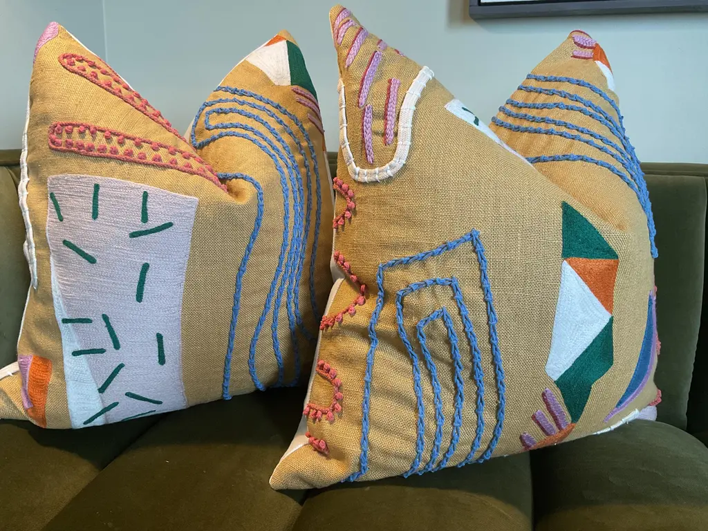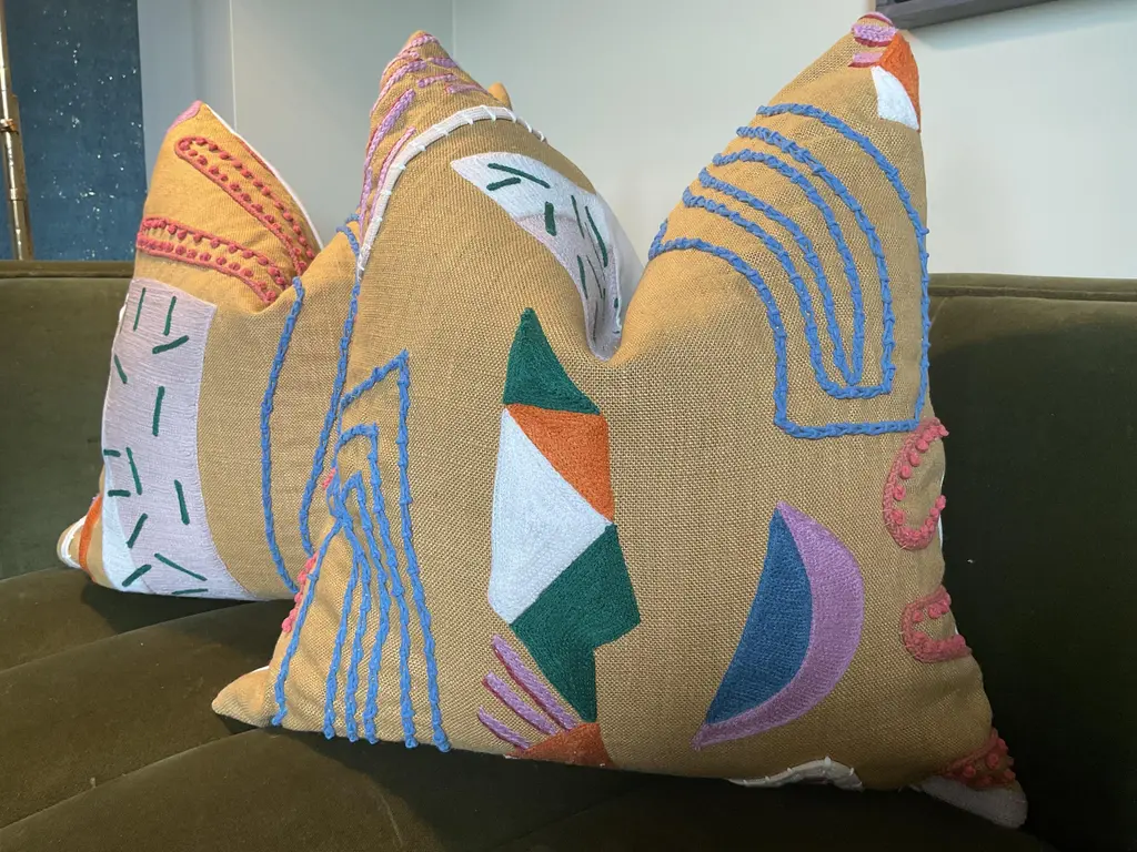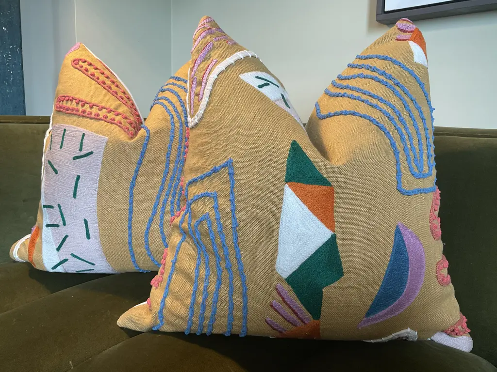 Pierre Frey Farrah Pillow Fabric from the Pierre Frey “Farrah” collection, the Sprinkles colorway is a vivid, lively textile that blends artisanal craftsmanship with a playful yet refined aesthetic. Hand‑embroidered in rope and ribbon, the pattern is free‑spirited and modern, with joyful pops of color that enliven any space. Backed in off white linen unless both sided option is selected. Pattern will vary. An absolute work of art. Each pillow is carefully crafted to showcase the fabric's exquisite pattern. We've paired the Farrah front with a complementary backing and finished it with a discreet invisible zipper. By choosing this Pierre Frey pillow, you're not just decorating – you're investing in a piece that combines timeless sophistication with modern craftsmanship. Elevate your home with this stunning blend of texture, pattern, and light. These will come as a 22" pair with plush- down inserts.