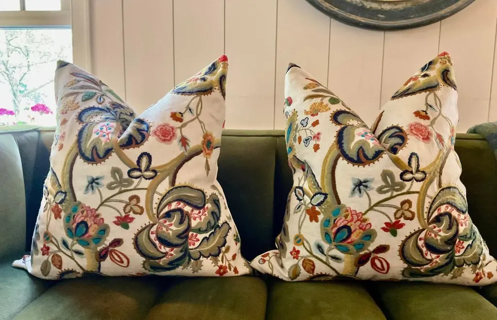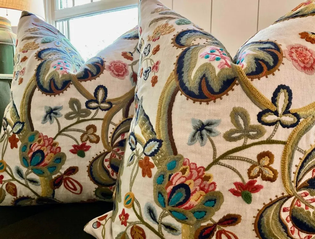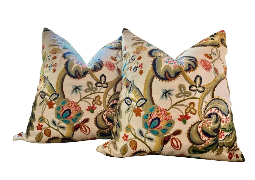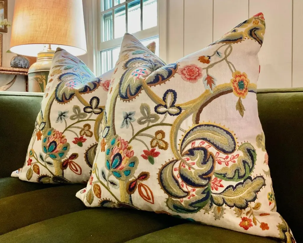 Immerse yourself in timeless elegance with our stunning luxury pillow, featuring a design inspired by 19th-century European textiles and 18th-century Indian palempores. The intricate pattern showcases large, sinuous flowering branches meticulously embroidered on a sophisticated linen herringbone weave.Crafted with meticulous attention to detail, these pillows feature a coordinating soft ecru velvet back (unless both sided option is selected) and a discreet invisible zipper closure. The varying pattern placement ensures that each piece is one-of-a-kind. Glorious rich shades of green, ecru, royal blue, turquoise blue, pink and rose.Offering for one pair (2) 22” plush-down filled complete pillows. These will feature Pierre Frey Les Colonies Braquenie on the front and a coordinating ecru velvet back. Closure will be by way of the invisible zipper.• Luxury pillows inspired by 19th-century European textiles and 18th-century Indian palempores• Intricate embroidered pattern on linen herringbone weave• Soft ecru velvet backing-• Invisible zipper closure• Sold as a pair• Pattern placement varies, ensuring uniqueness• Heirloom-quality craftsmanship• Offering is for a pair-22” down fill pillowsAbout UsAt Accent Marks, each designer pillow is crafted with care using the finest hand-selected fabrics and trims, paired with durable, discreet invisible zippers. We specialize in creating beautiful, high-quality pieces that elevate your home decor. While most of our listings feature 22" pillow pairs, we also offer a range of sizes and single pillow options to suit your needs. All of our Accent Marks pillows are proudly made in the United States.If you don't see the fabric you're searching for, please reach out via message as we have other fabrics available upon request and can create anything that you like. Thank you for visiting Accent Marks!