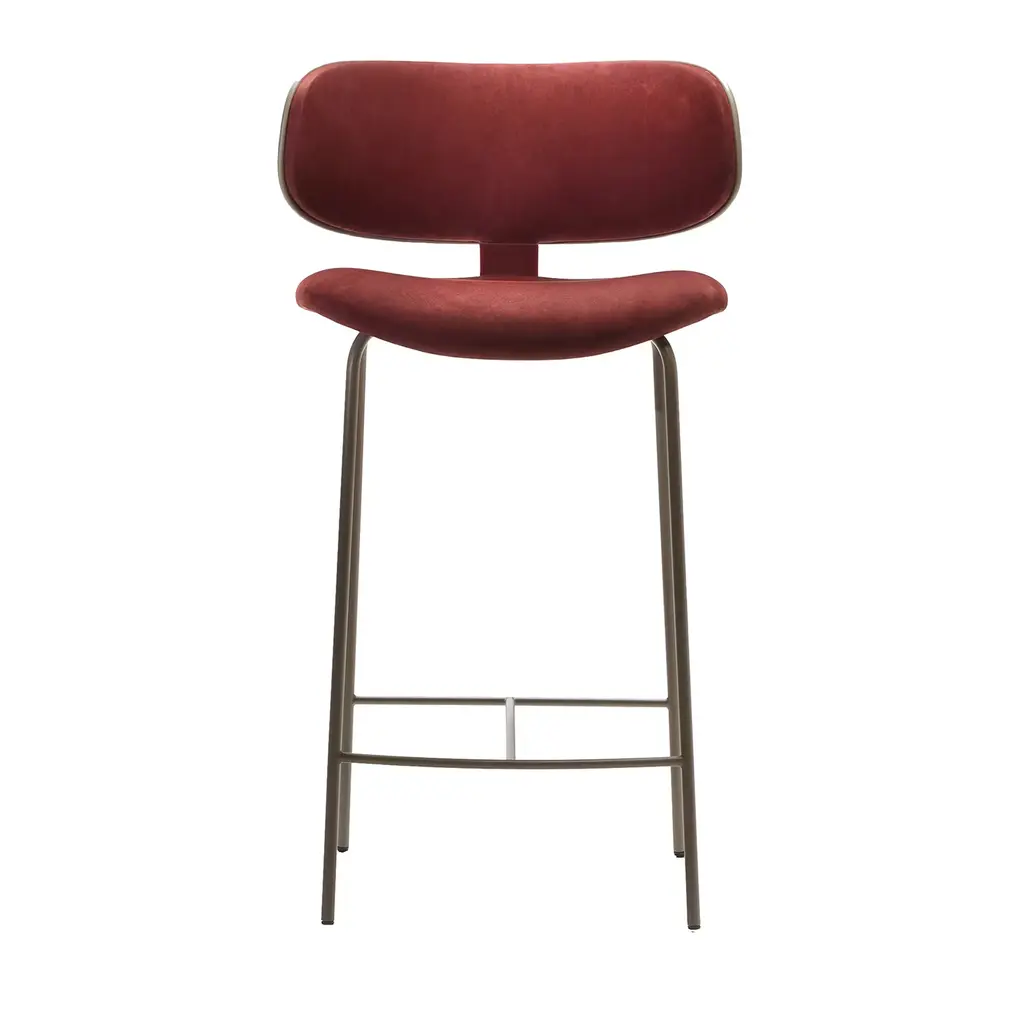 In Pil too, softness is evident even before you sit on it. Inspired by the object that is itself the symbol of softness, the pillow, and usually interpreted as an accessory, here the pillow plays the starring role, shaped and adapted to create a chair that conveys comfort and relaxation. The main components of the Pil too design stool are the backrest cushion and the seat cushion. The latter features a fold in the middle, created to generate an enveloping effect that physically and visually emphasises the feeling of softness. The base consists of metal legs, with the crossbars set at a special angle, to create an original graphic interweaving effect. In addition to the bar stool, other chairs complete the collection: Pil, (chair), Pil up (chair with higher backrest), Miss Pil (chair with armrests), Miss Pil up (chair with higher backrest and armrests), the Pil armchair and the Pil Armchair hi.
