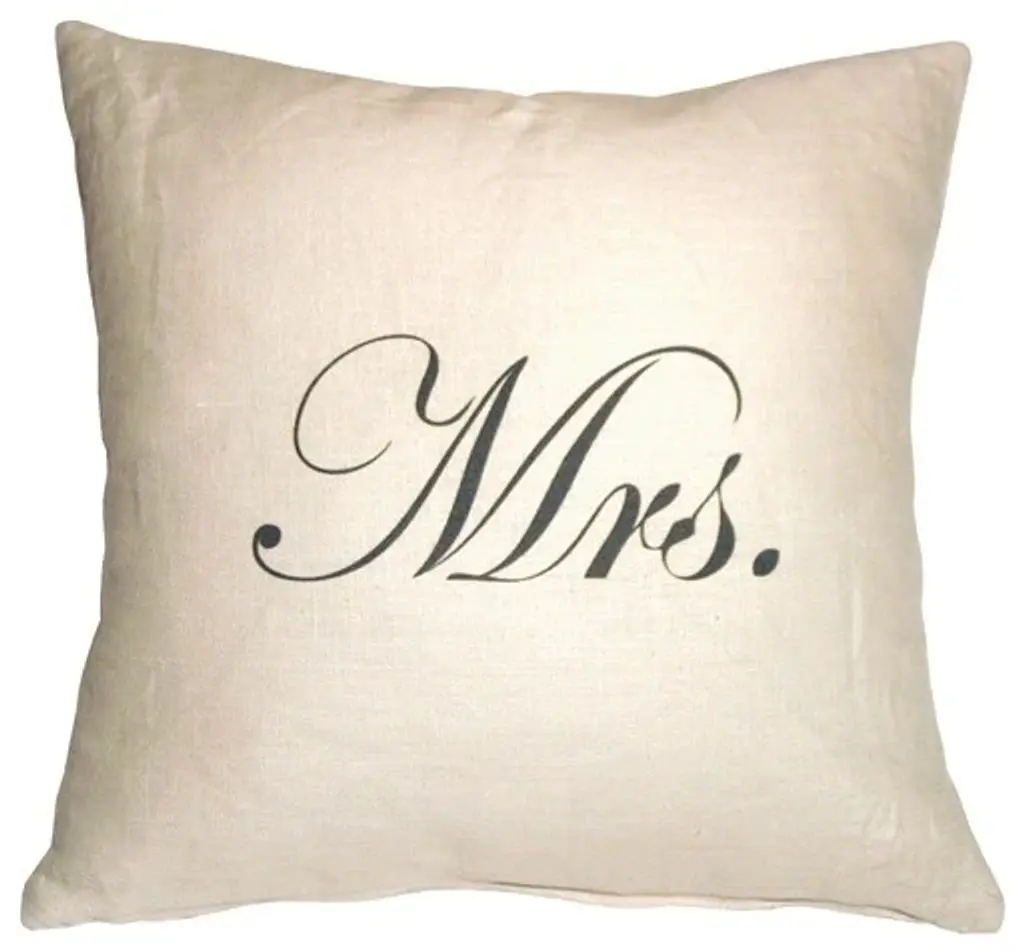 The Mr and Mrs 18 x 18 Linen Pillow Set is a perfect gift for the perfect couple -whether they have been married for 50 years, one year or have just announced their engagement. This elegant set of pillows is a fun way to claim your favorite side of the sofa or bed! They are made from 100% linen in cream and are printed with the Mr and Mrs titles in a charcoal grey whimsical font. The style of the pillow is vintage inspired and romantic. The back of the pillows is solid cream and they are finished with a color matched hidden zipper. This set of pillows looks gorgeous in a wedding decor setting, on a bed or on your sofa.Features:-Set of two pillows-Size: 18 x 18-Fabric: 100% Linen-Knife edge seems-Color matched, hidden zipper closure-Dry clean only-Filling: Polyester Fiber Fill • Pillow dimensions always refer to the pillow cover''s width and length while lying flat unstuffed and are rounded up to the nearest whole inch.
