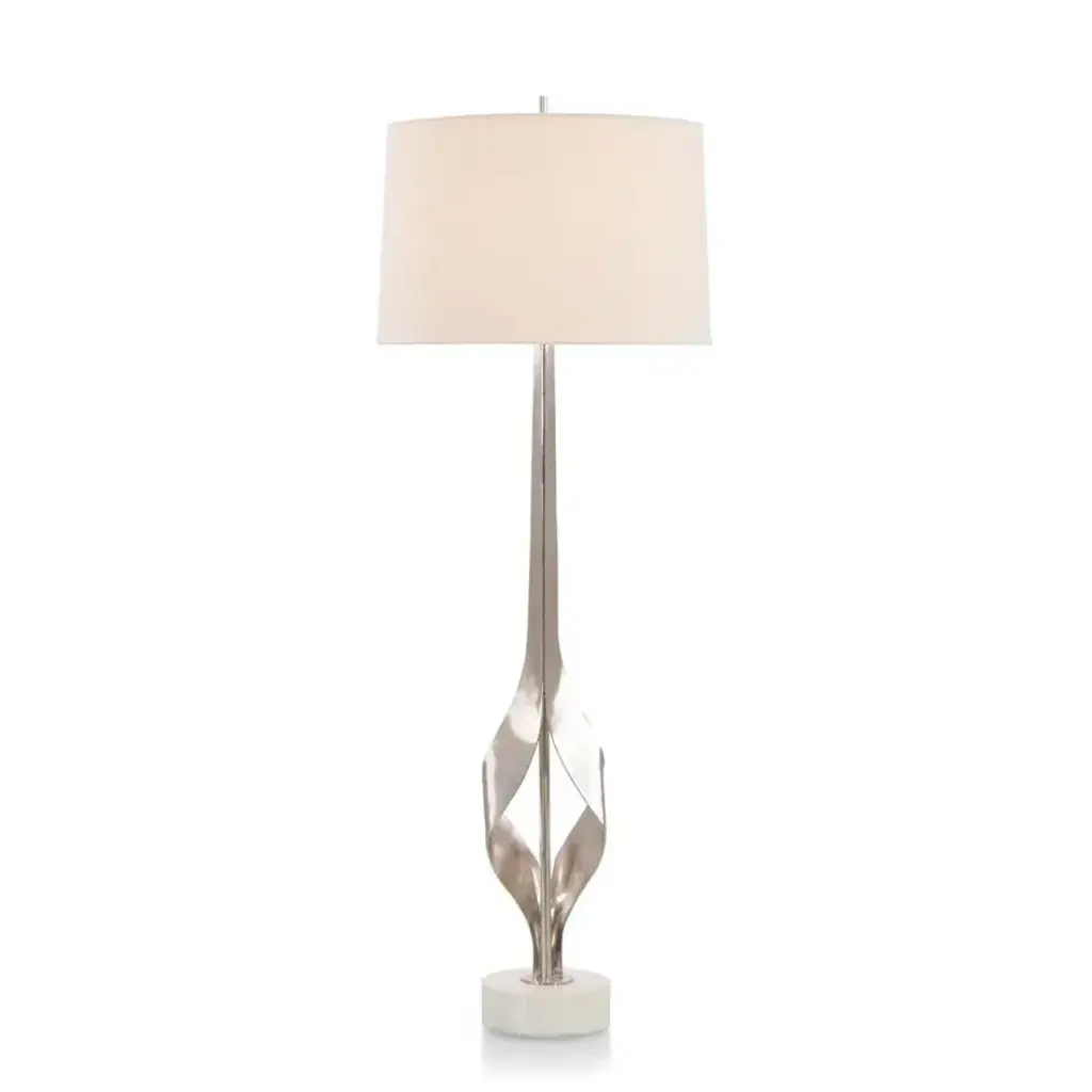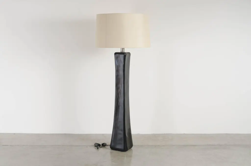 Pillow floor lampBlack lacquerHand repousseSilk shade (26" diameter)Limited editionEach piece is individually crafted and is unique.Lacquer is a technique that dates back to the Shang dynasty, circa 1600-1100 B.C. The pieces are made with at least 60 coats of organic lacquer. Each layer of lacquer is applied with a curing period of 24 hours in between so that it can dry.