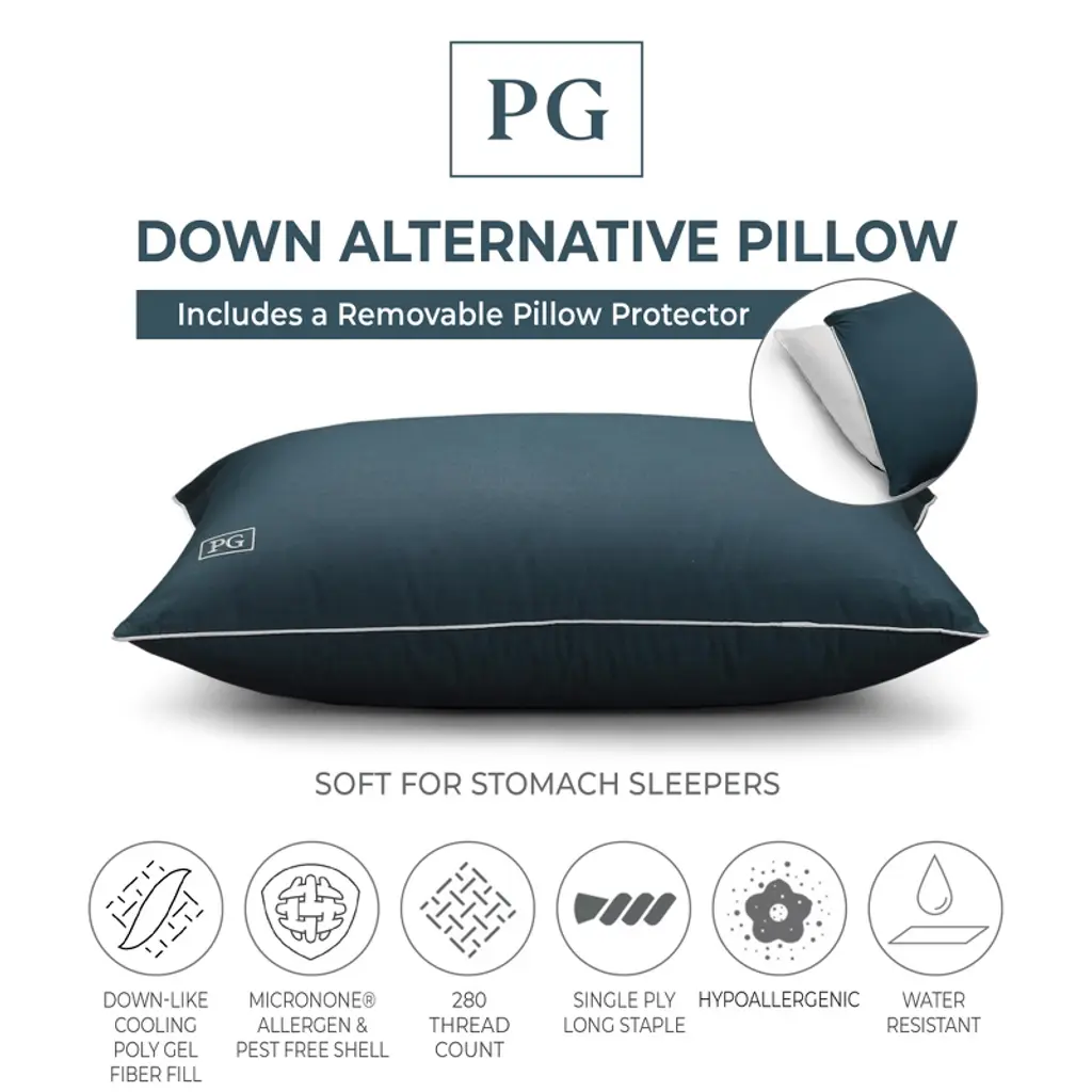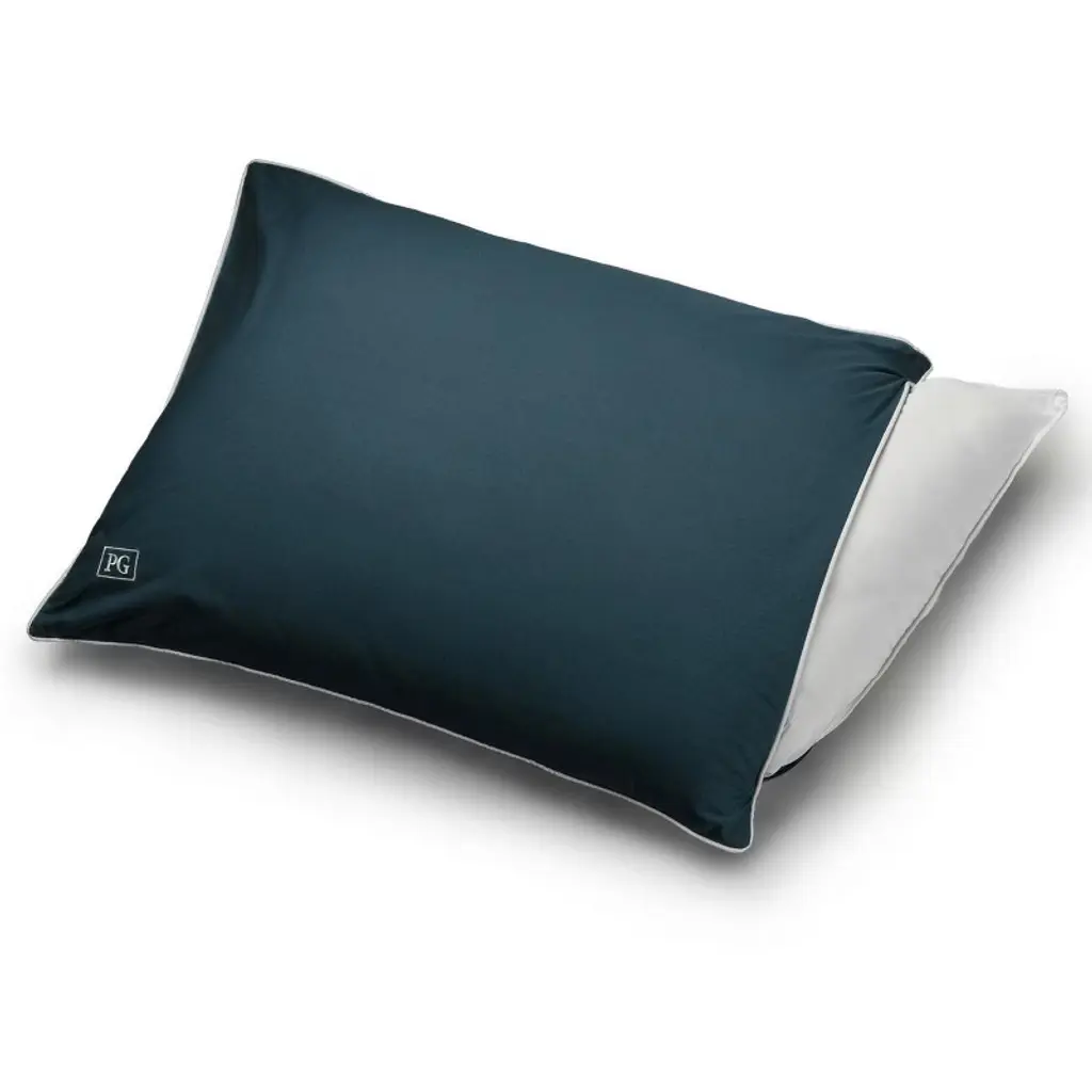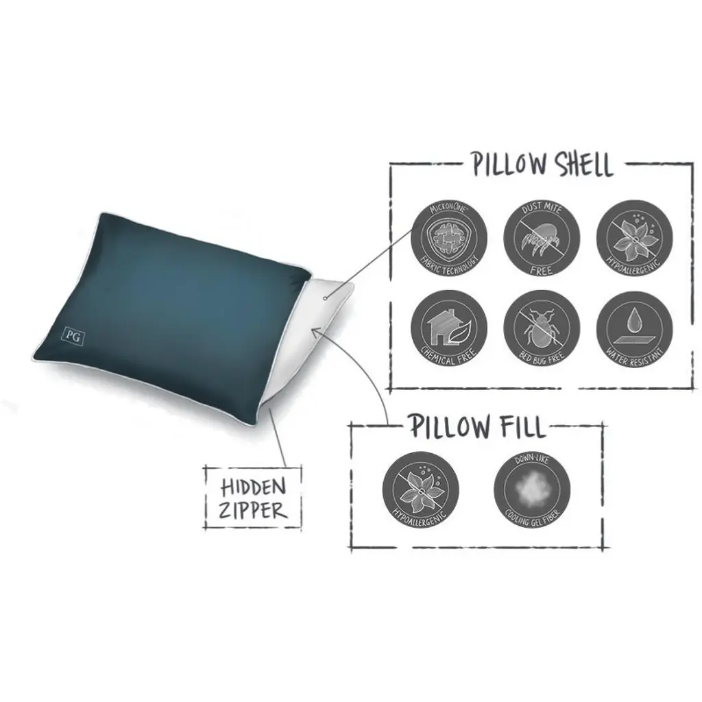 At PG the assortment is small and curated on purpose. You can be confident that everything that is marked with the PG brand is best-in-class. Our Pillow Guy Down-Alternative Pillow is covered in a soft microfiber shell using MicronOne Technology to stop allergens and microtoxins. It is filled with a naturally hypoallergenic fiber that mimics the support and feel of down. Each pillow comes with a removable 100% cotton pillow protector that is dyed in the stylish Pillow Guy Blue with a white satin welt cord and PG logo making your bed the most hip in town.