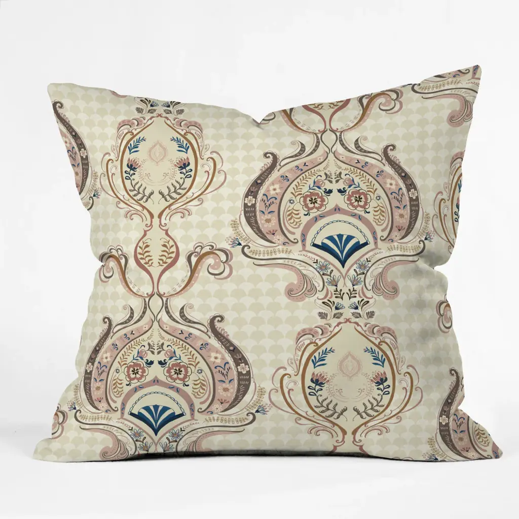 Pimlada Phuapradit Pink And Off White Floral Damasks Outdoor Throw Pillow
