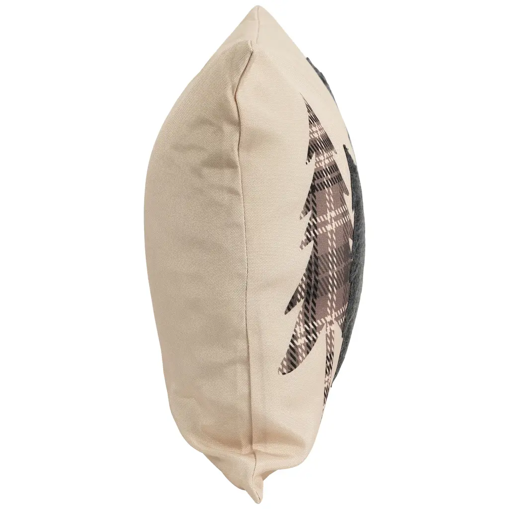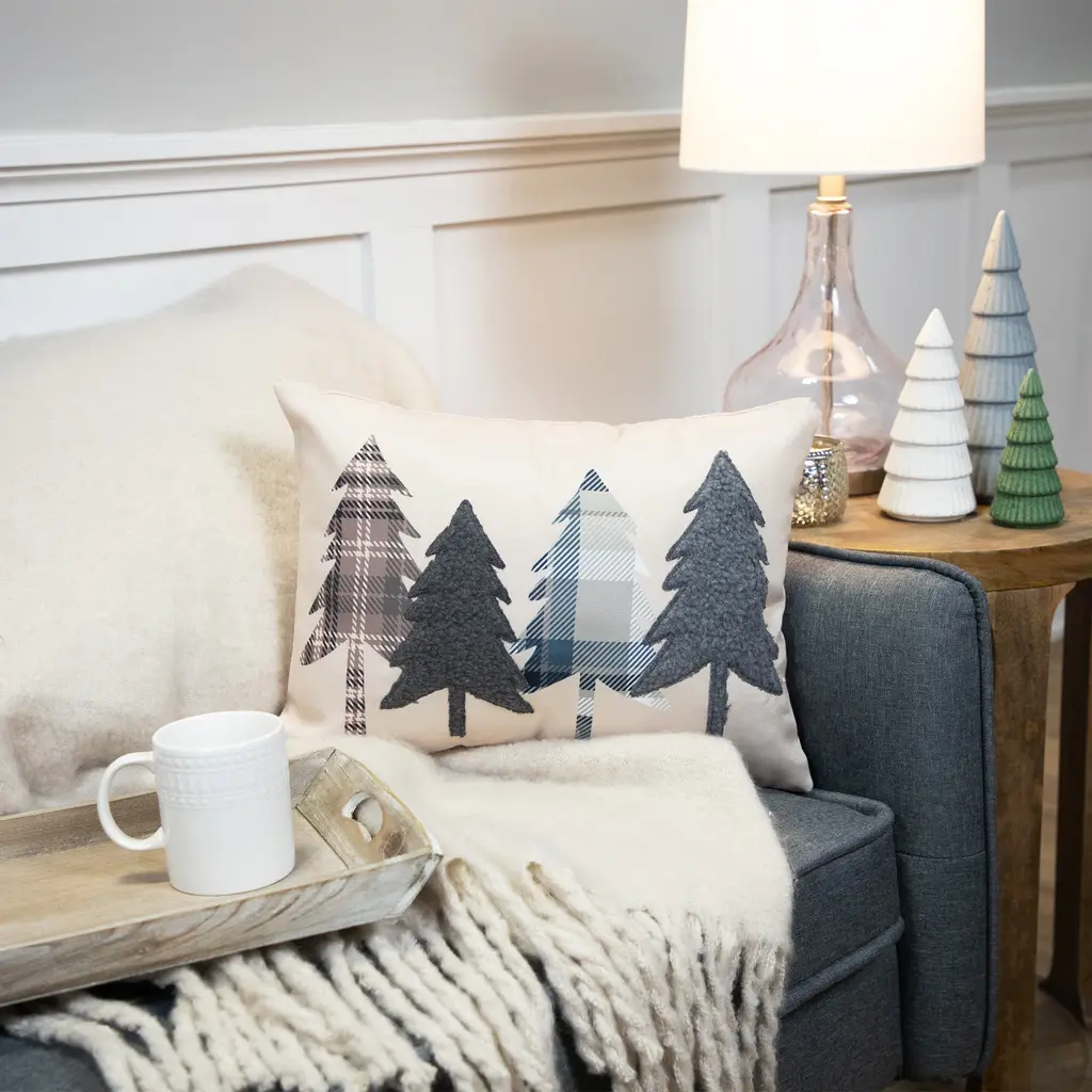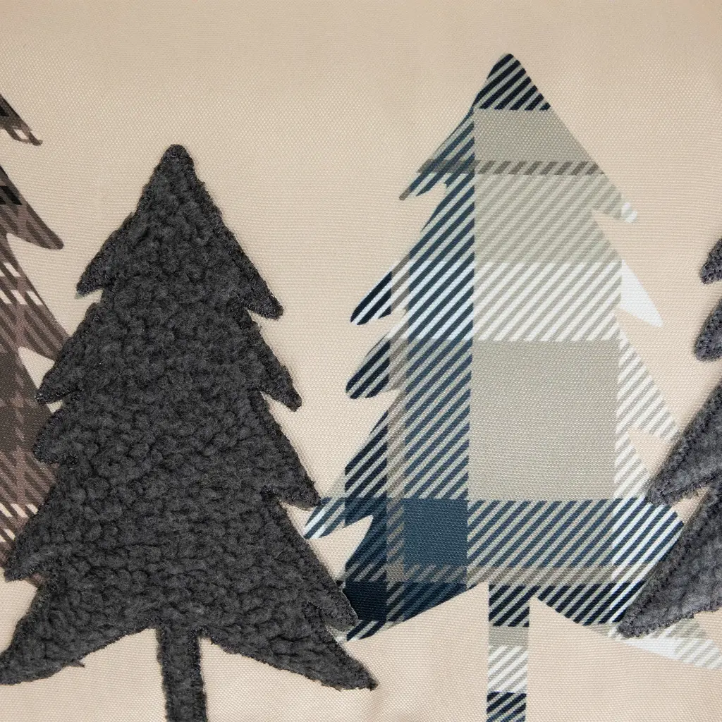 This accent piece effortlessly merges the warmth of nature with timeless cabin aesthetics. The meticulously embroidered solid and plaid pine tree silhouettes gracefully sprawl across a soothing tan backdrop creating an inviting atmosphere that resonates with rustic-inspired décor. Whether nestled on your couch or your favorite armchair this throw pillow brings the allure of the outdoors right into your home. Product Features: Color(s): brown tan black and blue Embroidered solid and plaid pine tree silhouettes Tan background For indoor use only Dimensions: 10.75" high x 15" wide Material(s): Shell: polyester Filling: polyester