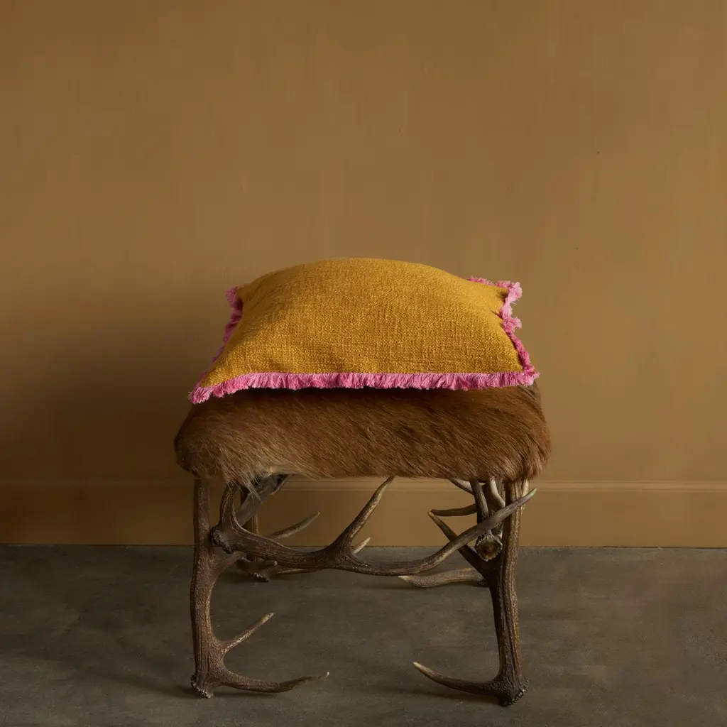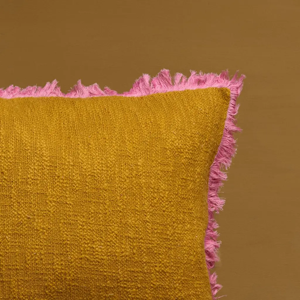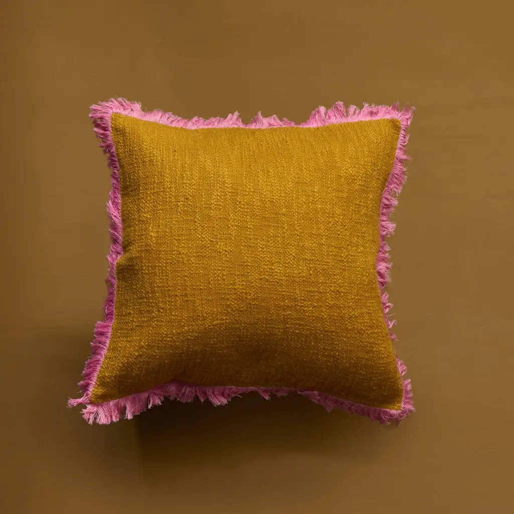 Bring colour to your room with this cushion set in a stunning shade of orange and pink. The Kadhi cotton fabric is finished with a striking pink grass fringe border entirely made by hand. Comes without filler, duck feather fillers can be ordered seperately. Size 50 x 50 cm.