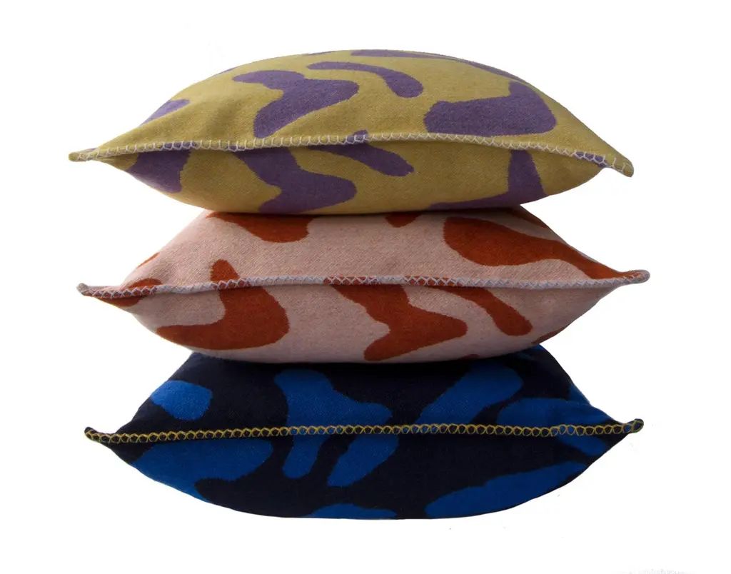 'Scatter' cushion pillow woven from recycled wool in navy and blue with yellow stitched edging by Granite + Smoke.Our recycled wool blankets are woven at a historic, 150 year old mill in the North of England. Woven on Jacquard looms they are double sided, a mid weight throw made from 100% recycled post-consumer textile waste; 70% recycled wool + 30% recycled other yarns. The bold, graphic patterns are inspired by London's graphic architectural landscape and modernist colours.Woven in England using the finest sustainably sourced recycled wool yarn from Italy. We work with specialist weavers in England who combine traditional weaving & finishing with cutting edge production and are experts in historical weaving and hand finishing. Material recycled wool. 100% British wool cushion inner.Made in England in limited runs.