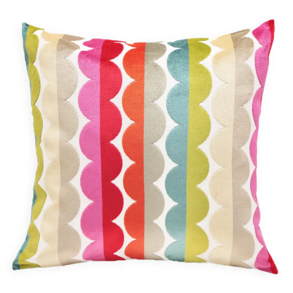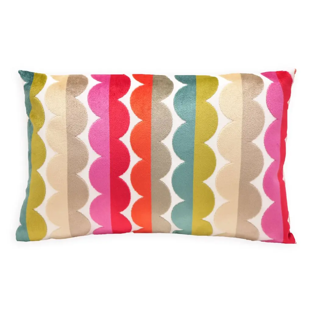 Indulge in luxurious comfort with our stunning dual-tone stripe scalloped cut velvet pillow. Made with high-quality materials and elegant design, it's a classic addition to any home décor. Solid white linen backing. Down insert included. Sewn with care in the USA. Size: 16" x 24" or 22" x 22" Material: Velvet Ships via FedEx Free shipping in the U.S.