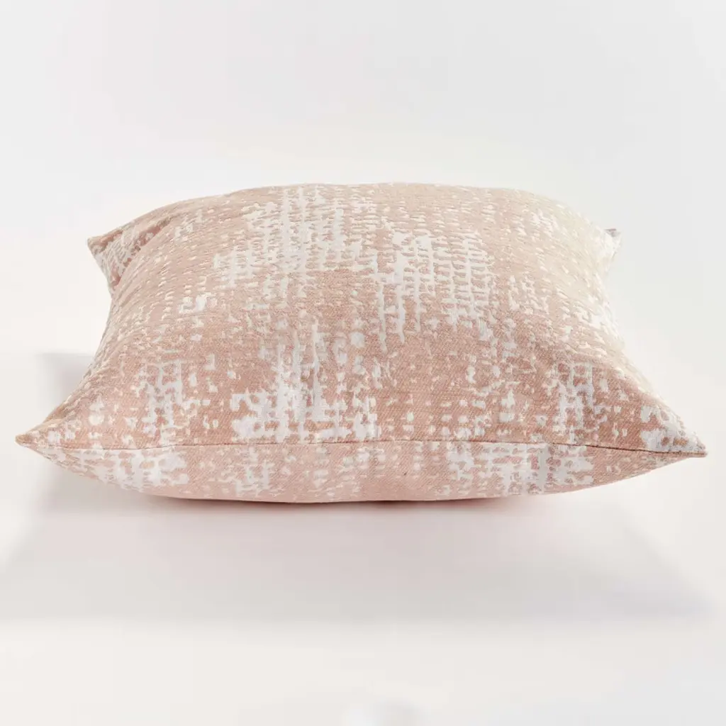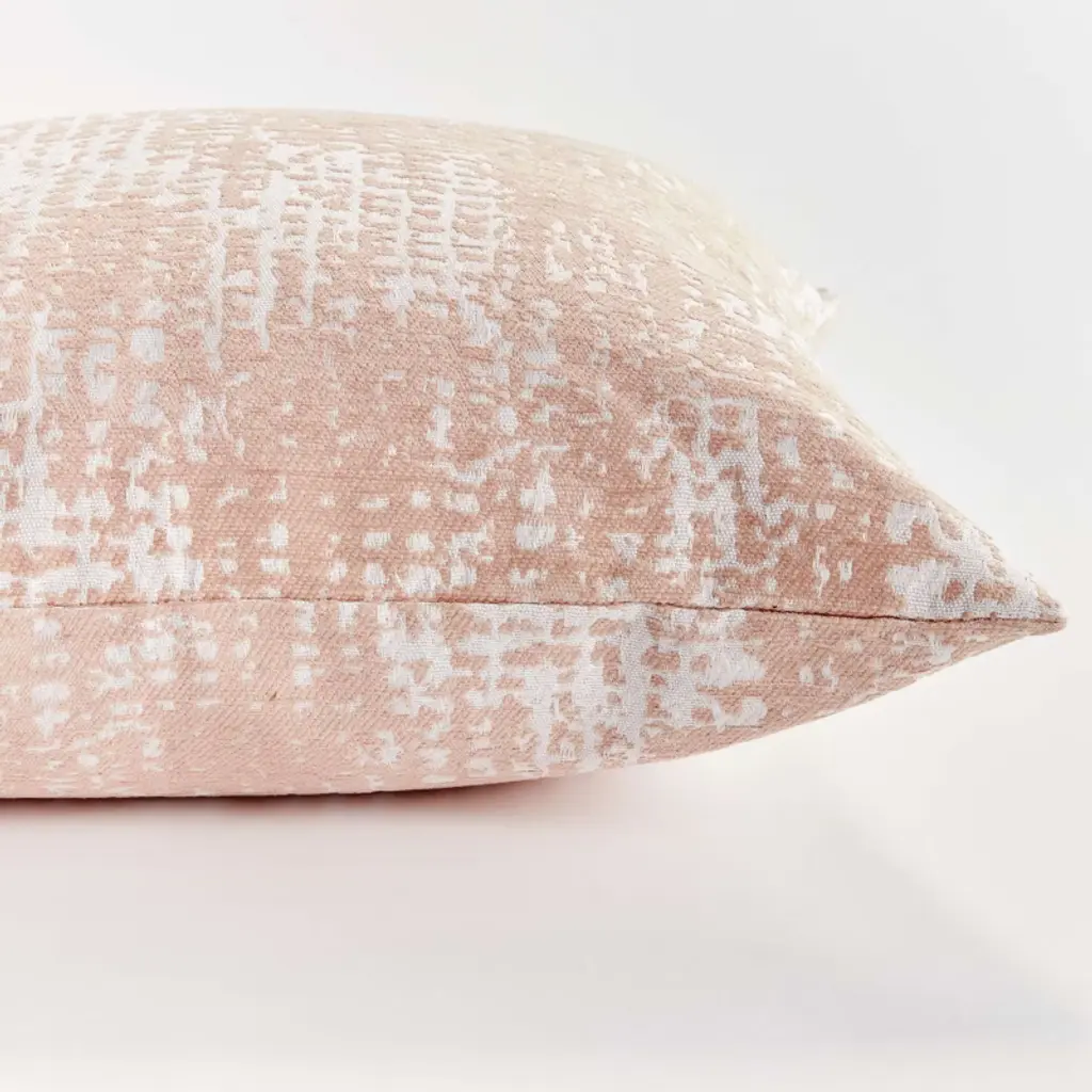 The indoor pillow that lives beautifully outdoors. Enjoy the upscale luxury and durability of Jacquard. With a woven blush and white pattern, it plays well with any palette. This pillow is weather resistant and responsibly made. Filled with 100% recycled fibers.