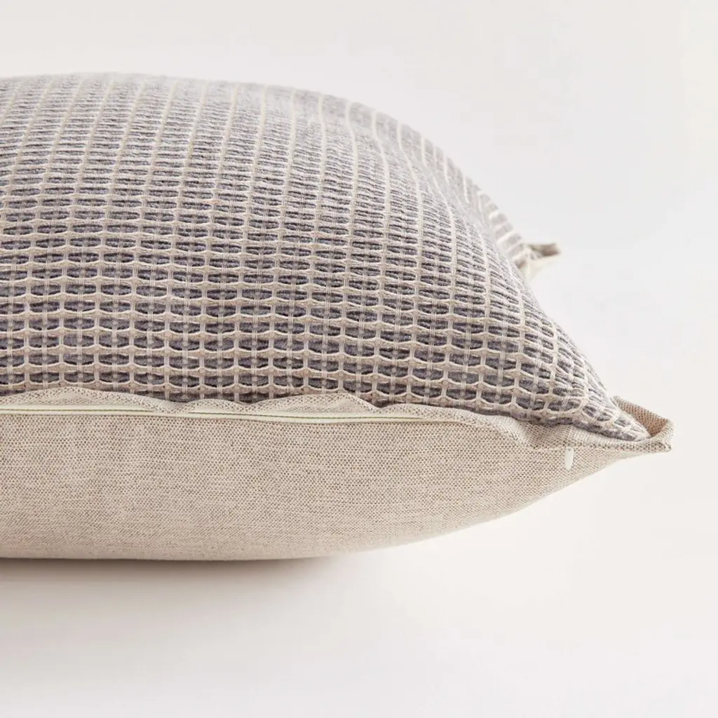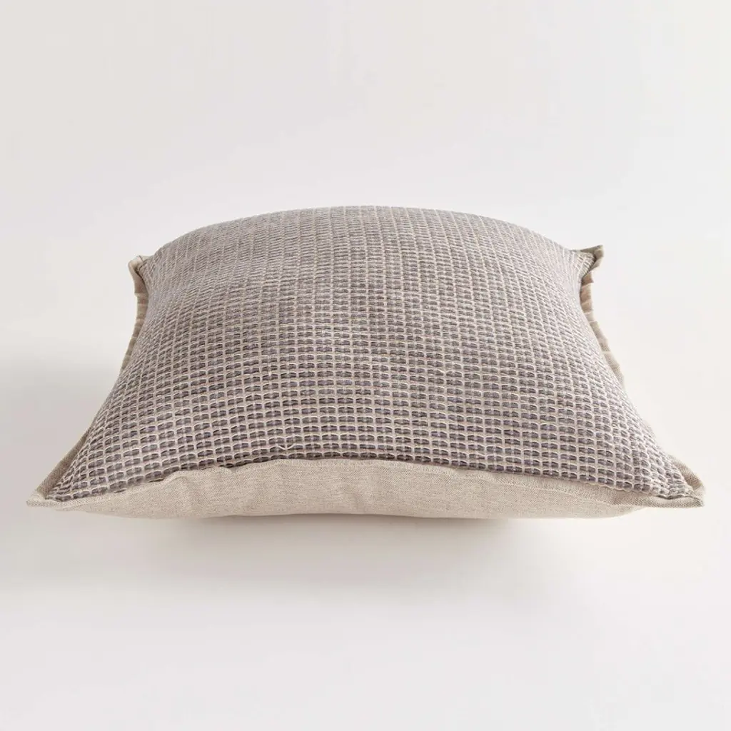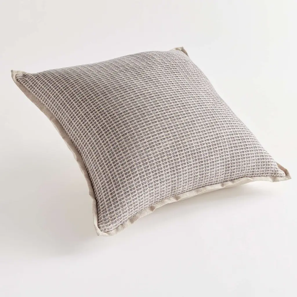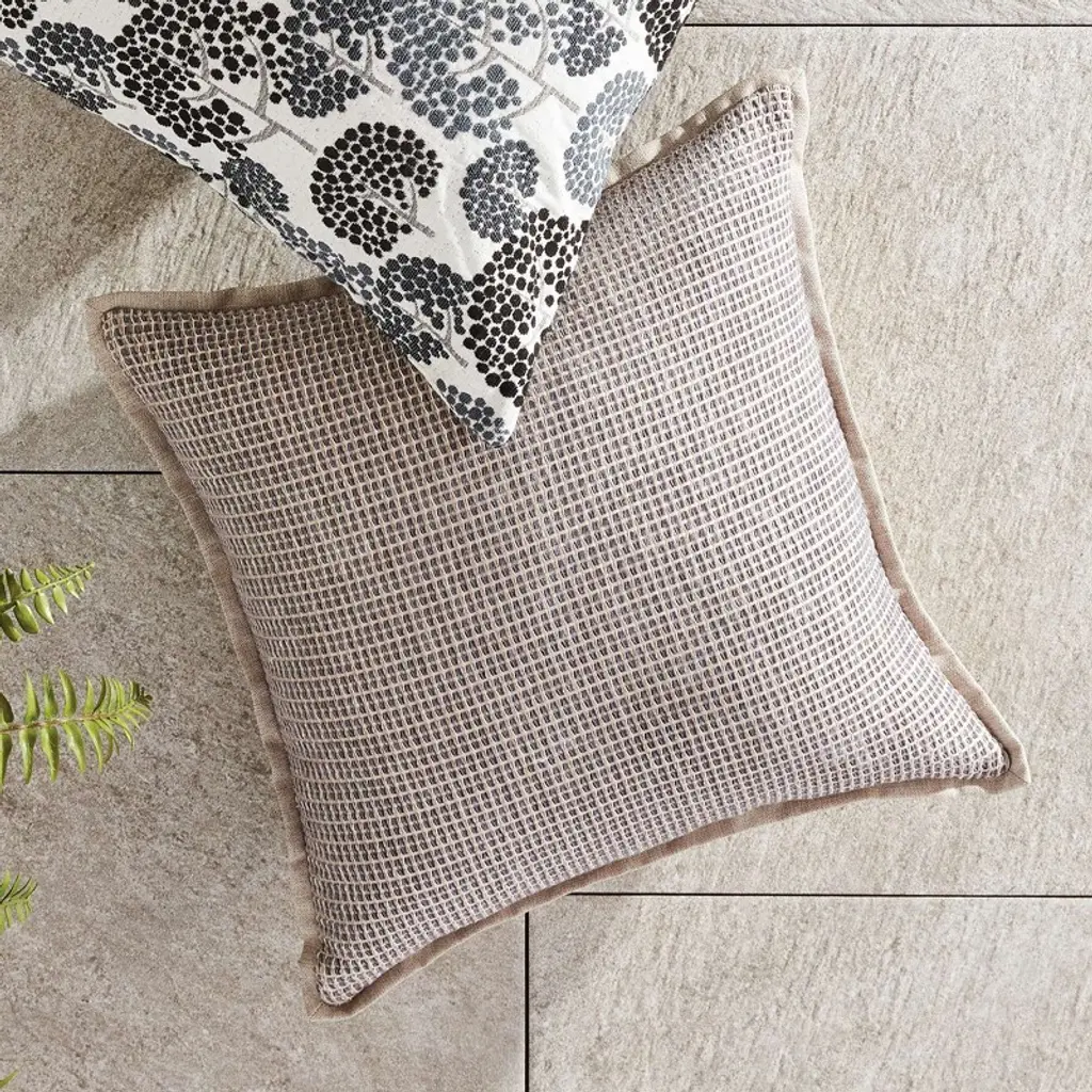 The indoor pillow that lives beautifully outdoors. Enjoy the upscale luxury and durability of Jacquard. With a woven taupe texture, it plays well with any palette. This pillow is weather resistant and responsibly made. Filled with 100% recycled fibers.