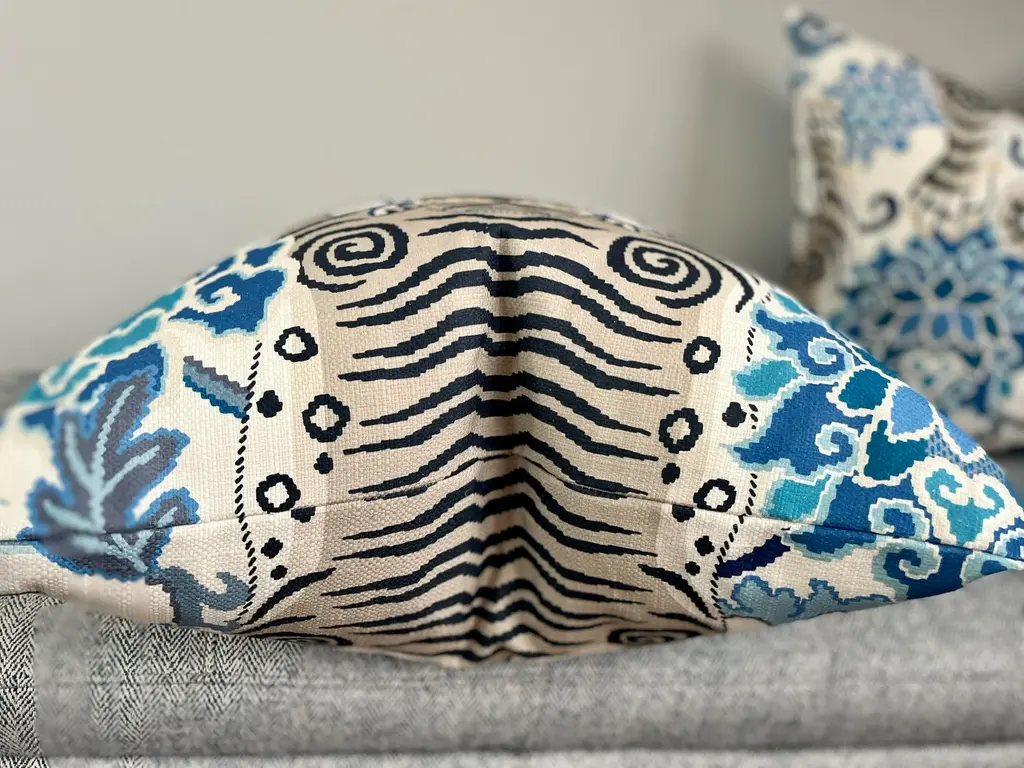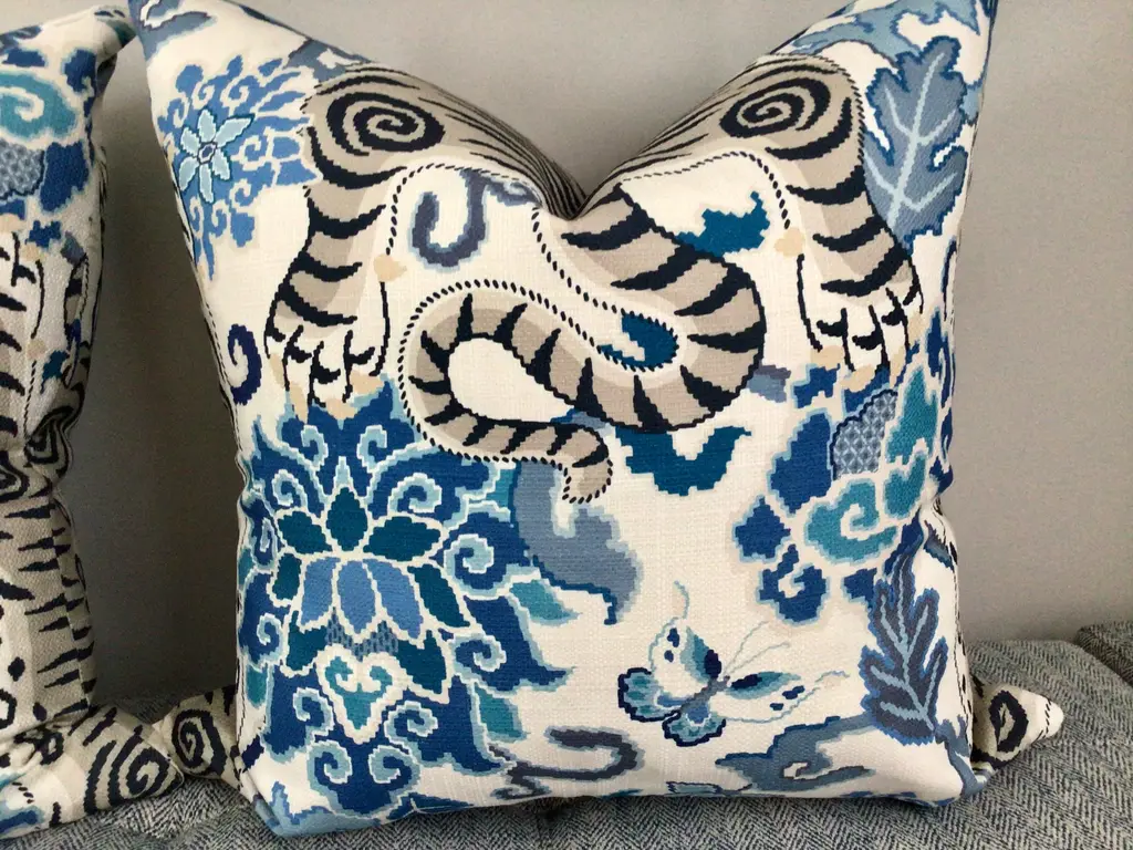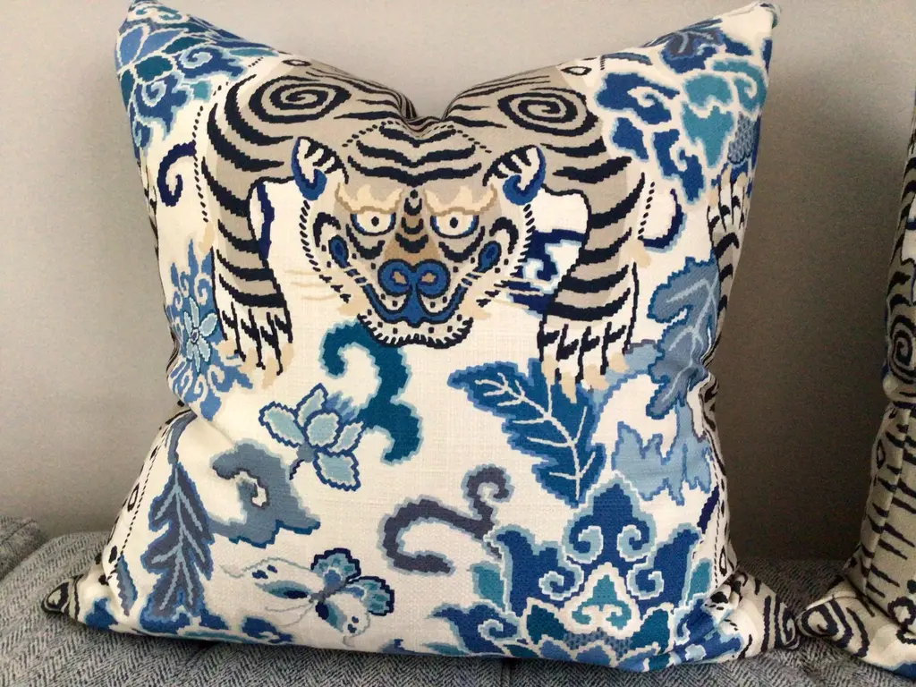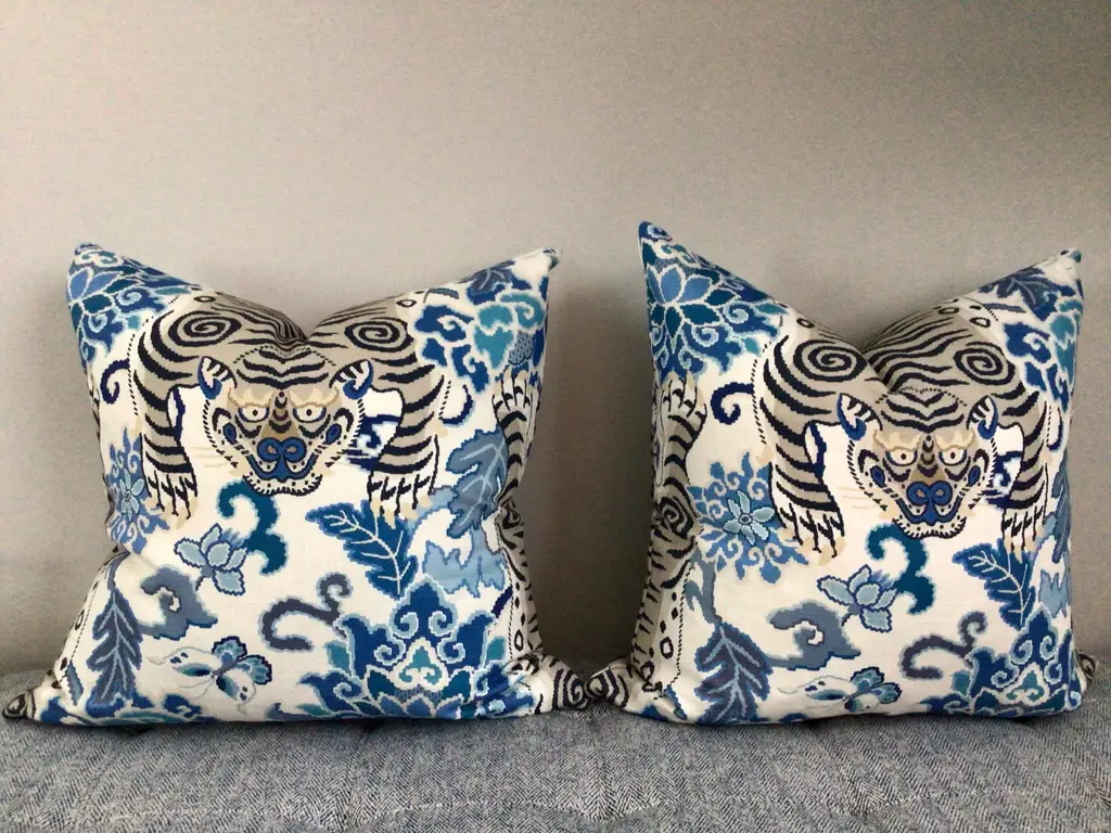 FAB statement pillows in rich, saturated color tones on heavy weight woven fabric. Tibet Tiger features a large centered tiger in rich cream on a crisp linen background. Bold accents in coral, blue, and black. These will feature the Tibet Tiger wrapping around front to back/ head to toe and come as a complete set filled with generous down inserts. The closure will be by way of invisible zipper.