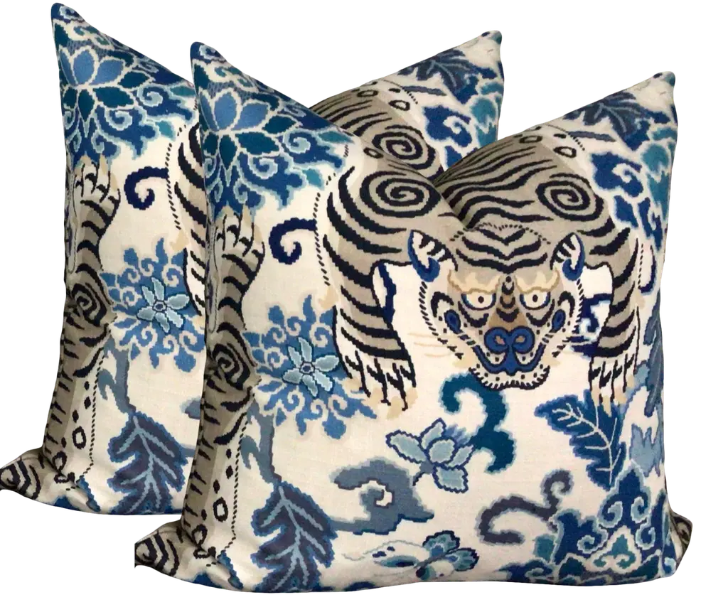 Plush Down Filled Tibet Tiger Pillows In Blue - A Pair
