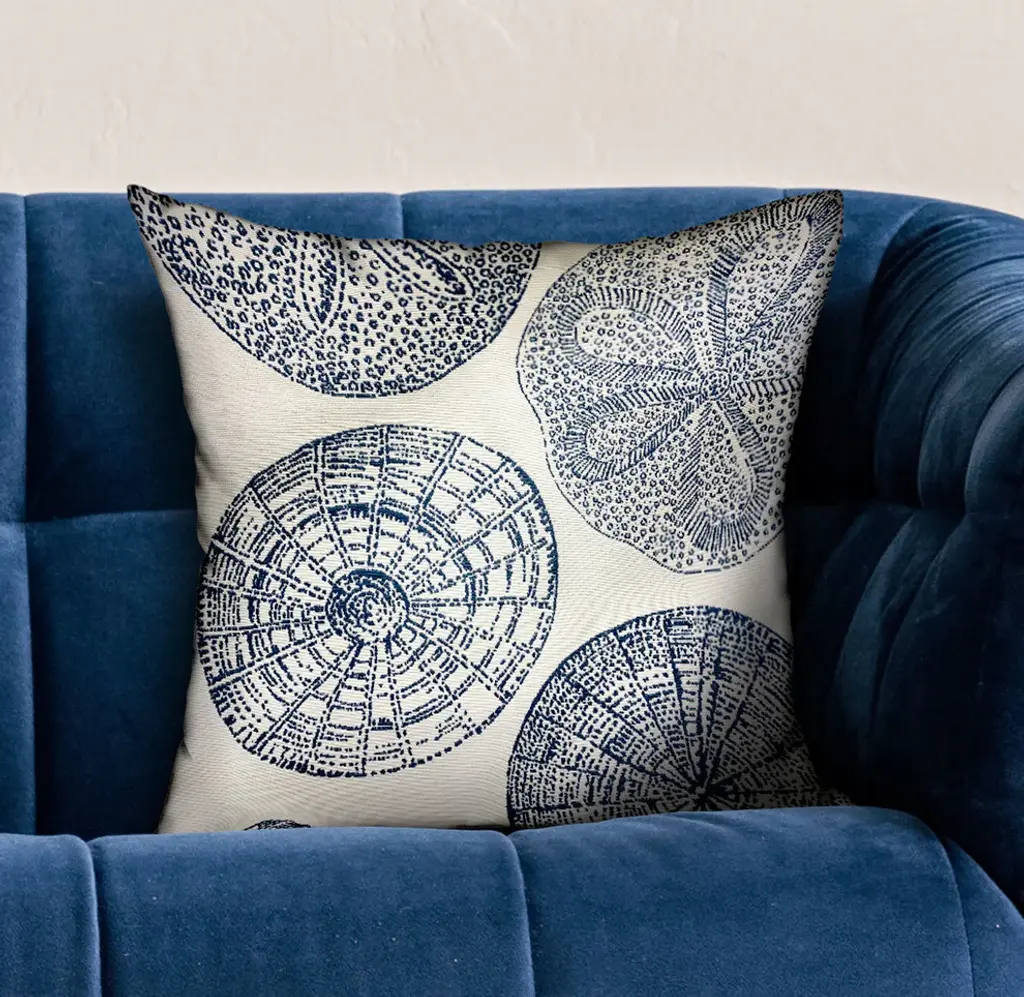 This fashion forward pillow design features unique handcrafted fabric, made from the finest materials to dazzle your eye and feed your senses. This memorable design will add warmth and sophistication to any living space.plutus seashell haven blue, cream motif luxury throw pillow. The fabric of this luxury pillow is a blend of Cotton, Polyester.• Colors: Blue, cream• Fabric Origin: China. Pillows are Handmade in USA• Double Sided pillow• Invisible zipper enclosure for a tailored look• All seams are over-locked and stitched for a professional finish• Pattern placement may vary slightly• Pillow measurements are seam to seam from the inside• Pillows include • Made in USA• Hypoallergenic Down Alternative Polyfill Insert• Dry Clean recommended• Fabric Content: 60% Cotton / 40% Polyester• Pattern: Motif• Flammability: CAL 117-2013, NFPA 260, UFAC I• Cleaning Code: 10% Bleach Cleanable, Water Based Cleaning Agents