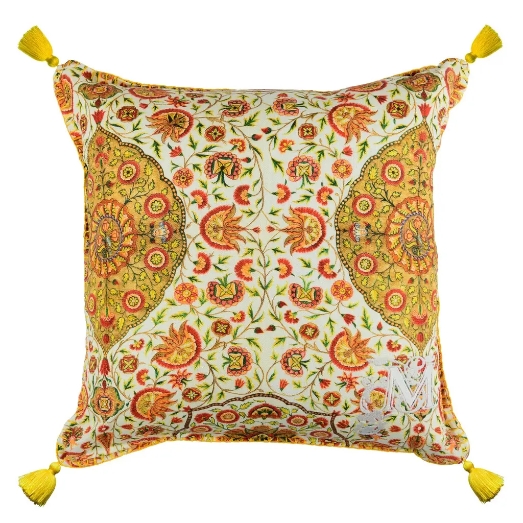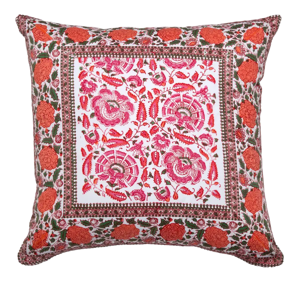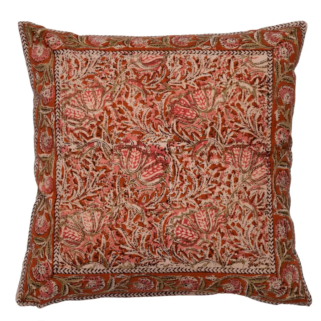 The Poppy-Bluebell design combines a botanical poppy motif on one side with a bluebell foliage pattern on the reverse. Simply flip the pillow to refresh your room whenever you desire a change. Dramatic designs in rich earth tones imbue our handmade kalamkari pillow covers with a feeling of elegance and tradition. Kalamkari originated as a Persian pen drawing on cloth which is reflected in the intricate detail of these beautiful fabrics. Modern-day kalamkari textiles are created by combining ancient block printing techniques from South India with Persian-influenced motifs of paisleys, flowers and geometric patterns drawn from architecture. Curate an eclectic collection of patterns and rustic hues with these timeless pillow covers and subtly shift the ambiance of your room. *Some color rub-off is to be expected in kalamkari hand printed textiles. We recommend cold washing separately before use. Materials: 100% cotton. Product Features: Finished with a zipper closure on the edge for easy reversibility. Decorative Pillowcase/Pillow Case - cover only. Insert not included. Crafts: Hand block printing. DIMENSIONS Pillow Cover: 16" x 16" square CARE & MAINTENANCE Protect from direct sunlight when using. Hand or machine wash separately in cold water on gentle cycle. Use a mild detergent without any bleach or fabric softeners. Do not soak or wring the fabrics. Scrub gently if needed. Tumble dry on low heat or air dry in the shade. Iron at medium setting. Test stain remover on a small area before applying.