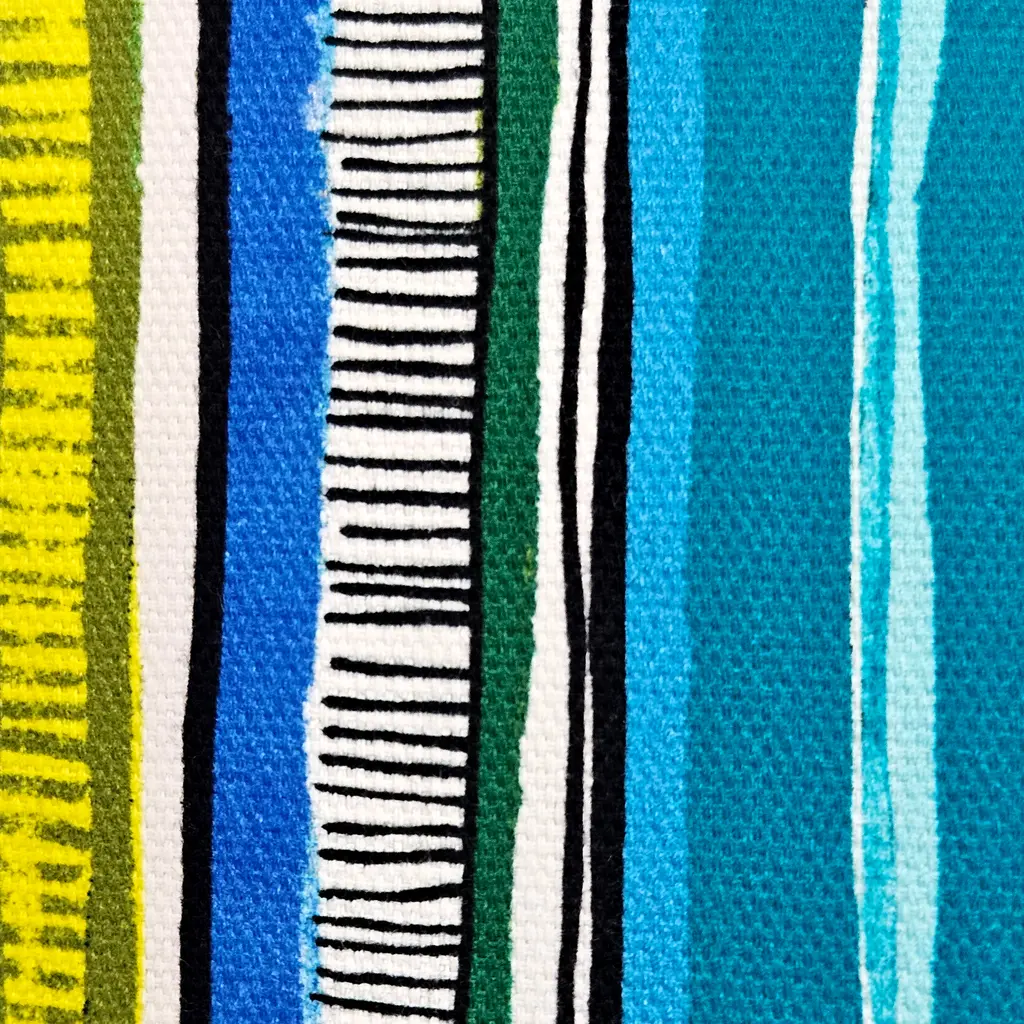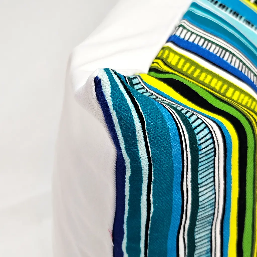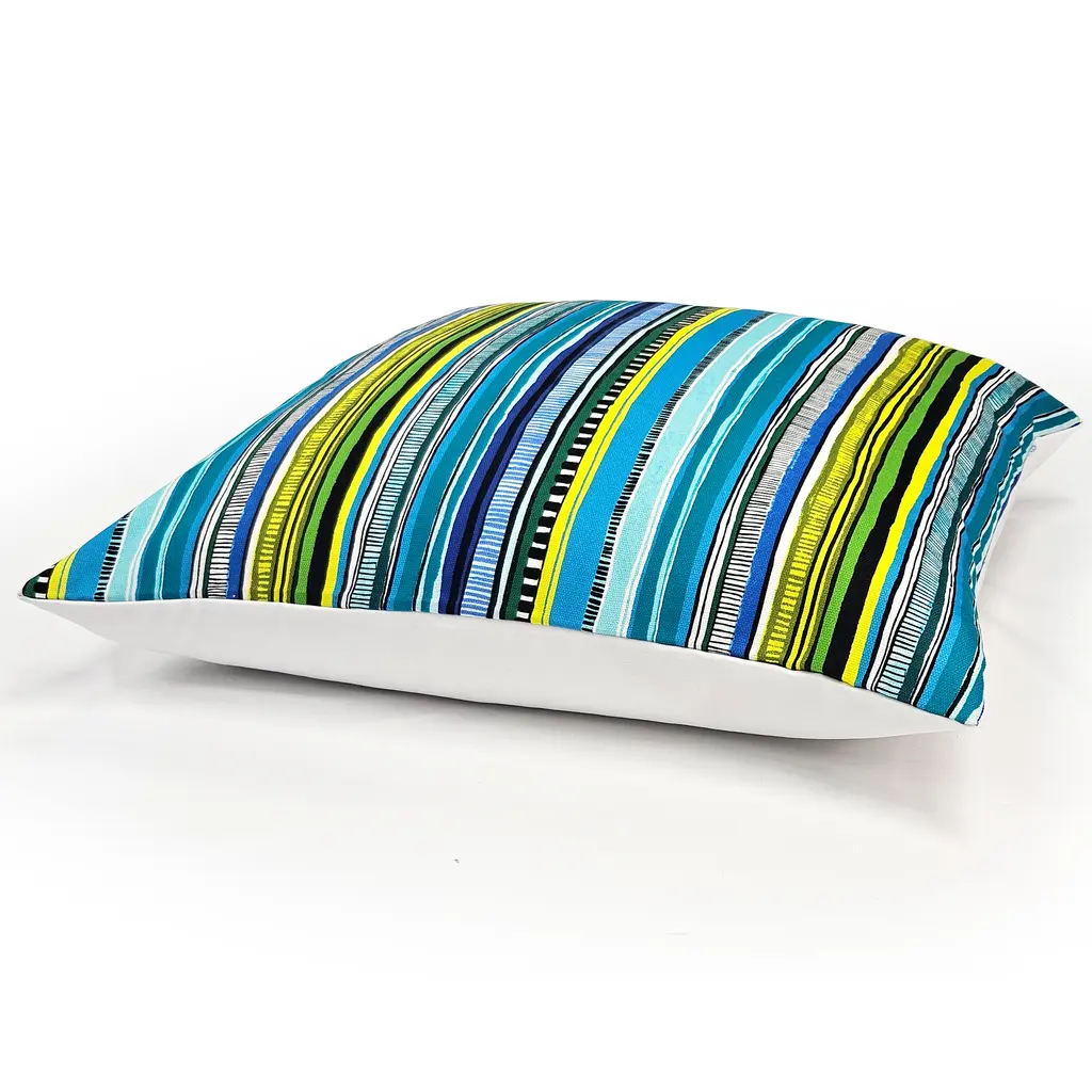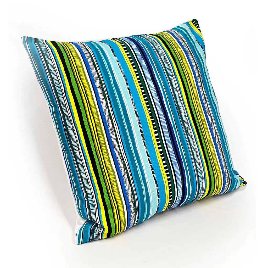 This large 25 inch square striped pillow speaks for itself! Bold and colorful, the Power Stripe Fiesta Pillow features a dazzling array of bright teal, blue, green, and yellow stripes. Made from a soft, 100% cotton fabric and backed with a medium weight white cotton canvas, this large pillow is one you can really sink into. Size: 25"x25" Square Fabric: 100% Cotton Design on front only. Solid white back. Knife edge seams. Inside seams are reinforced for strength and durability. Hidden zipper closure in bottom seam of pillow cover Cold water wash separately on delicate. Tumble dry low. Made in Canada: Designed and made in Pillow Decor's Vancouver workroom.