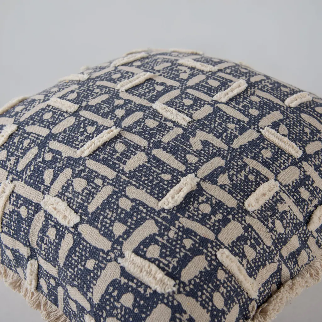 Printed on recycled cotton canvas, this pillow features a distressed printed pattern. Eyelash fringe in cotton frames the pillow for a crafted appeal. The back is 100% cotton back in a solid coordinating color with a hidden zipper closure for ease of fill and cleaning. This pillow is at home in all decors where printed patterns will join solids and stripes in defining a stylish decor.
