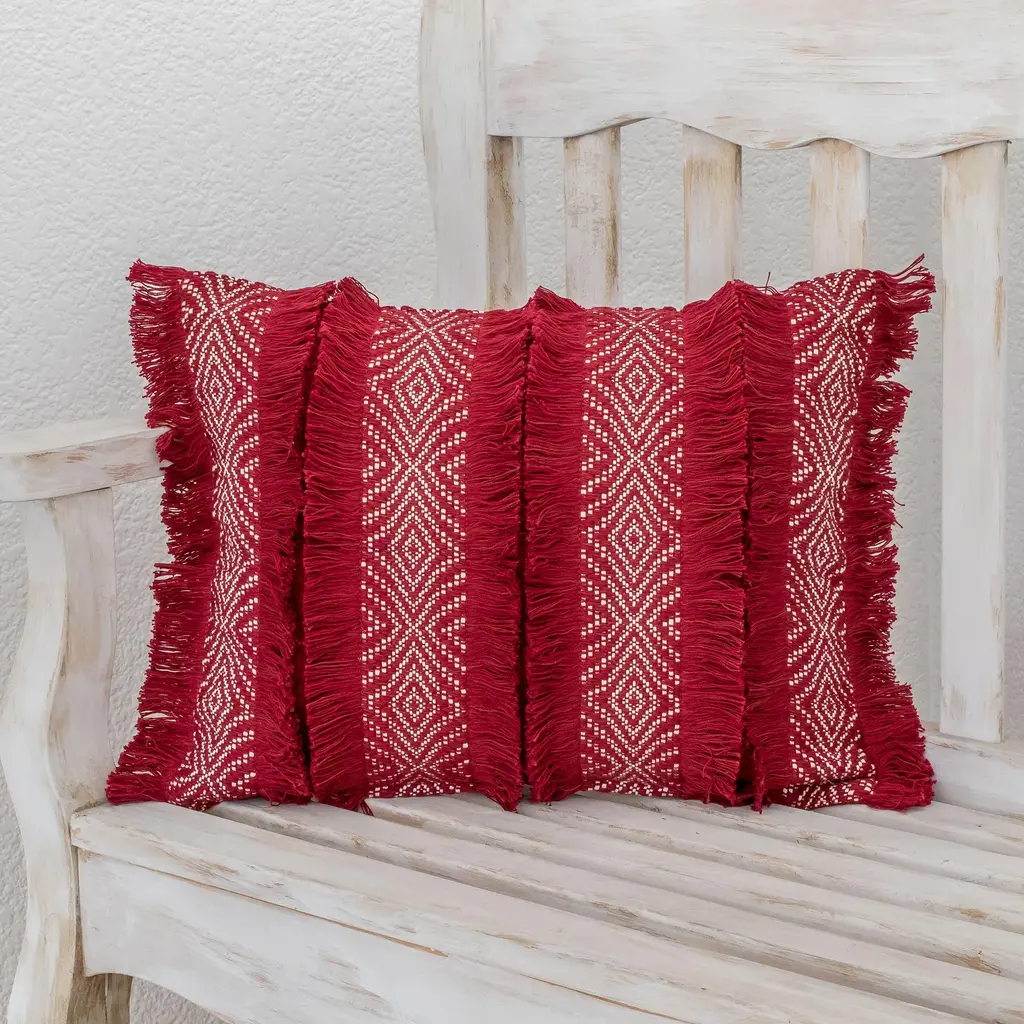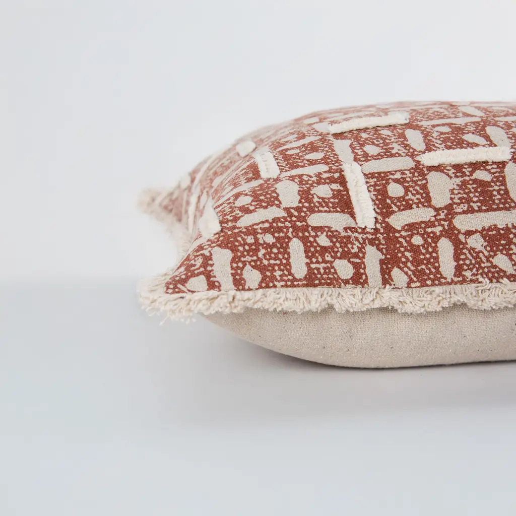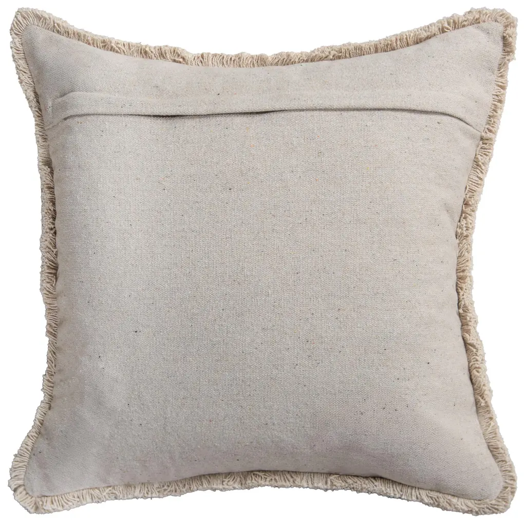 Printed on recycled cotton canvas, this pillow features a distressed printed pattern. Eyelash fringe in cotton frames the pillow for a crafted appeal. The back is 100% cotton back in a solid coordinating color with a hidden zipper closure for ease of fill and cleaning. This pillow is at home in all decors where printed patterns will join solids and stripes in defining a stylish decor.