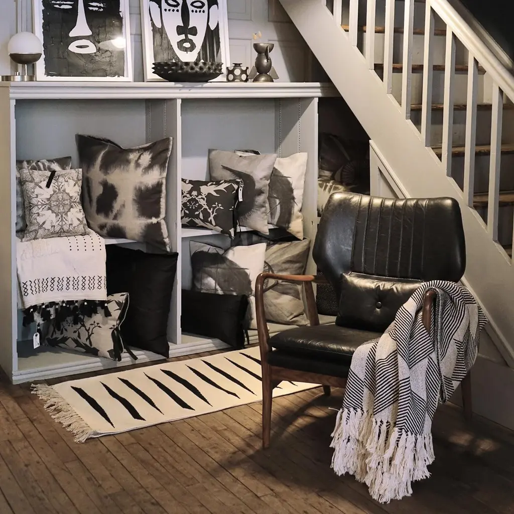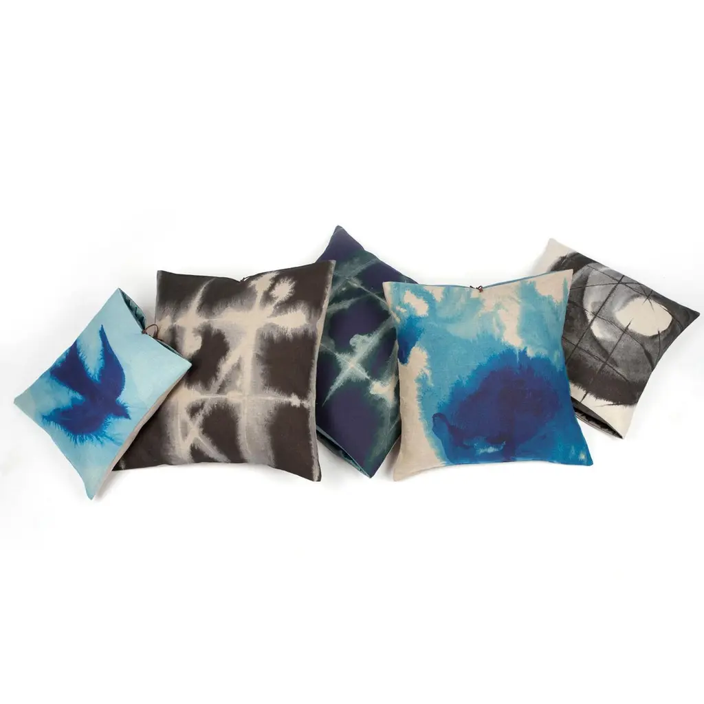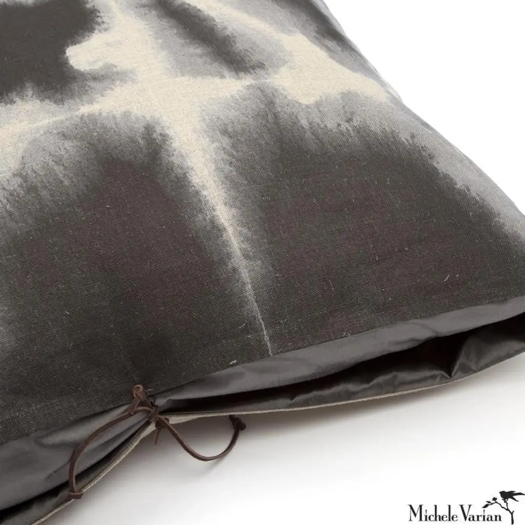 A luxury handmade decorative throw pillow made of printed Belgian linen, great for adding comfort and casual, laid-back style to a contemporary living room, bedroom or lounge. Belgianlinen is high quality, durable, naturally made fabric from the flax plant. The modernprinted graphic is from an original watercolor painting by Michele Varian. The cushioncover has a functional and decorative leather tie closure, and silk insertflap. The traditional knot tie closure at the top ensures that there are nohard elements on our pillows like buttons or zippers. The pillow includes agenerously filled feather and down blend insert. This tosscushion is designed by Michele Varian and handcrafted inNYC.Product DetailsBelgian LinenLeather tie closureRemovable American-made insert included 95%feather 5% downPlease inquire regarding a hypoallergenic insert optionMeasures: 24 inches x 24 inchesDry clean removable cover onlyMade in NYC.