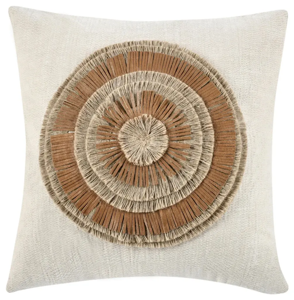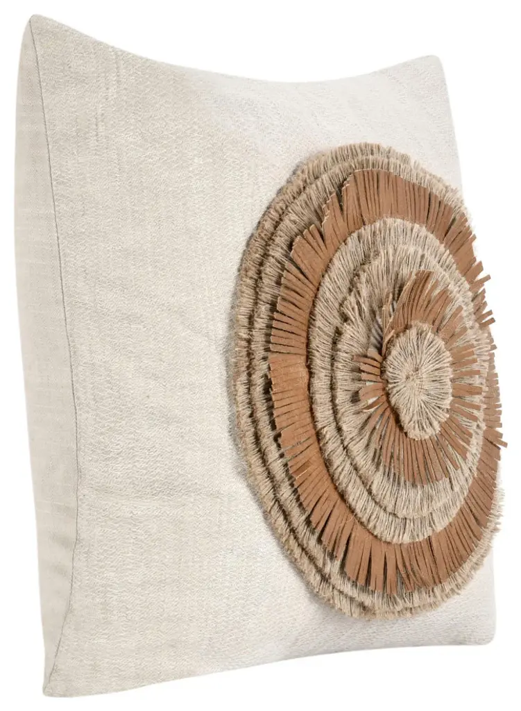 Concentric rings of fringe alternating between jute and leather create the textural sunburst design of this pillow while hand embroidery adds a delicate effect.100% CottonChestnut/NaturalGenuine Leather and Jute Applique DetailsLight Hand-Applied Embroidery for Additional TextureHidden YKK ZipperLuxury Feather and Down insertKnife Edge Finish100% Cotton Back Spot clean. Dry Clean. Transitional Pillow fluff technique: forcefully throw pillow straight down to land on bottom seam to achieve maximum fullness