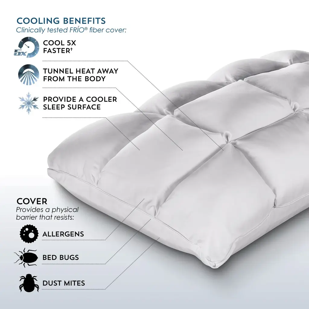 Scrunch up to cool comfort with the Sub-0 SoftCell Chill pillow. This reversible pillow offers individual pockets filled with a down-like material for extra support and comfort on one side. The other side has gel-covered memory foam. Plus, the FRIO® rapid chill cooling fibers funnel heat away from your body and provide a cooler sleep surface. The locking zippered machine washable cover resists allergens and dust mites for a healthier sleep.