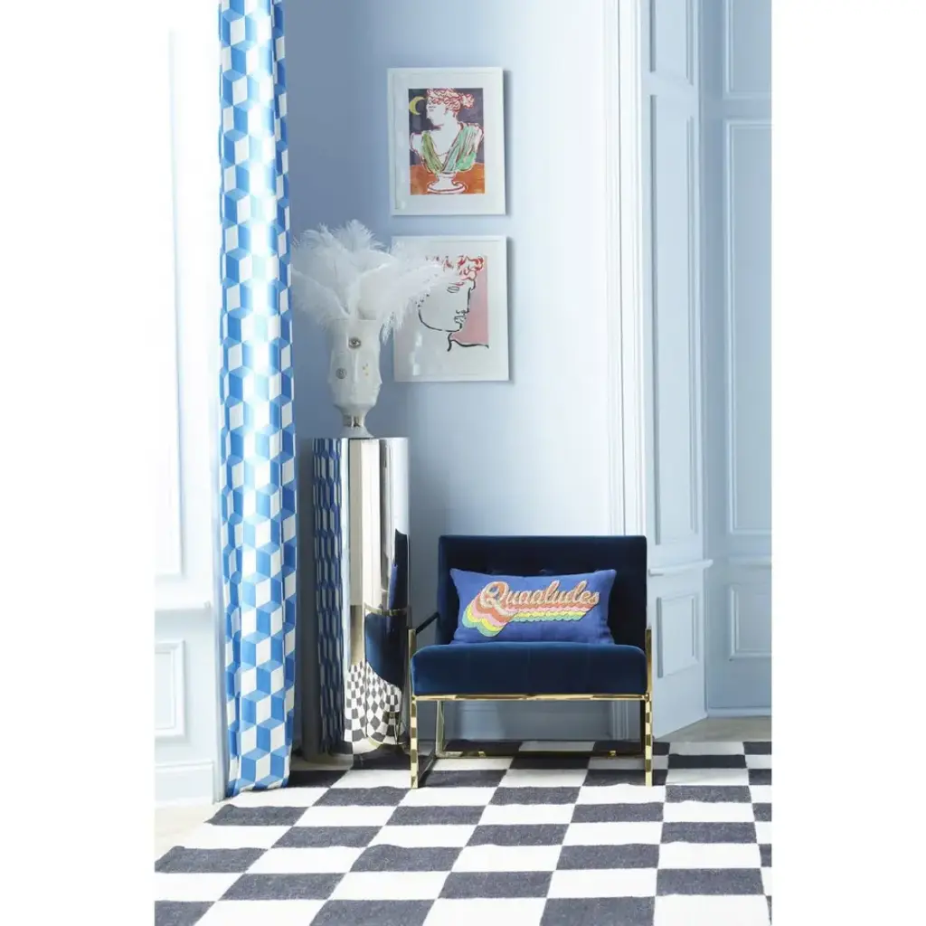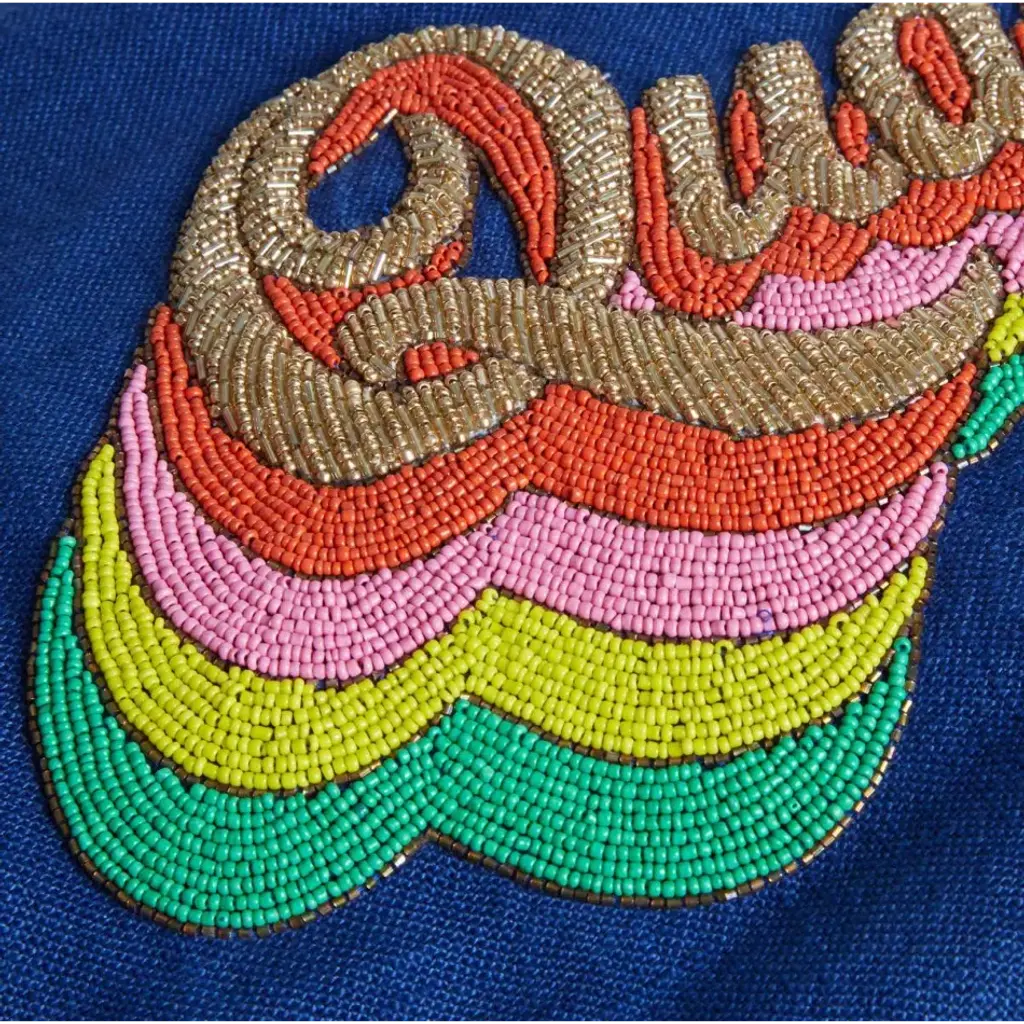 JA himself is a teetotaler who gets his vicarious thrills through art, and our hand-beaded Quaaludes pillow is especially delirium inducing. Inspired by counterculture designs from the 60s—trippy, colorful typography laced with sparkly gold. We collaborated with an artisanal workshop in India where a master beader imbued our clean graphic designs with craftsmanship and soul. Each artwork is hand-beaded on linen ground and takes nearly 100 hours to create. Beads of varying heights and patterns within patterns create a sense of depth and dimension. The result is part pop art, part textile triumph.