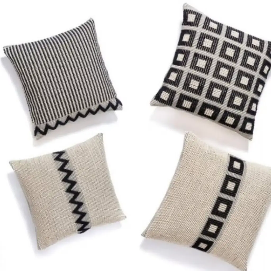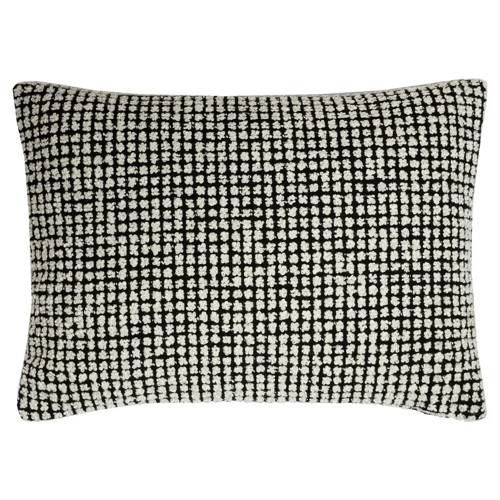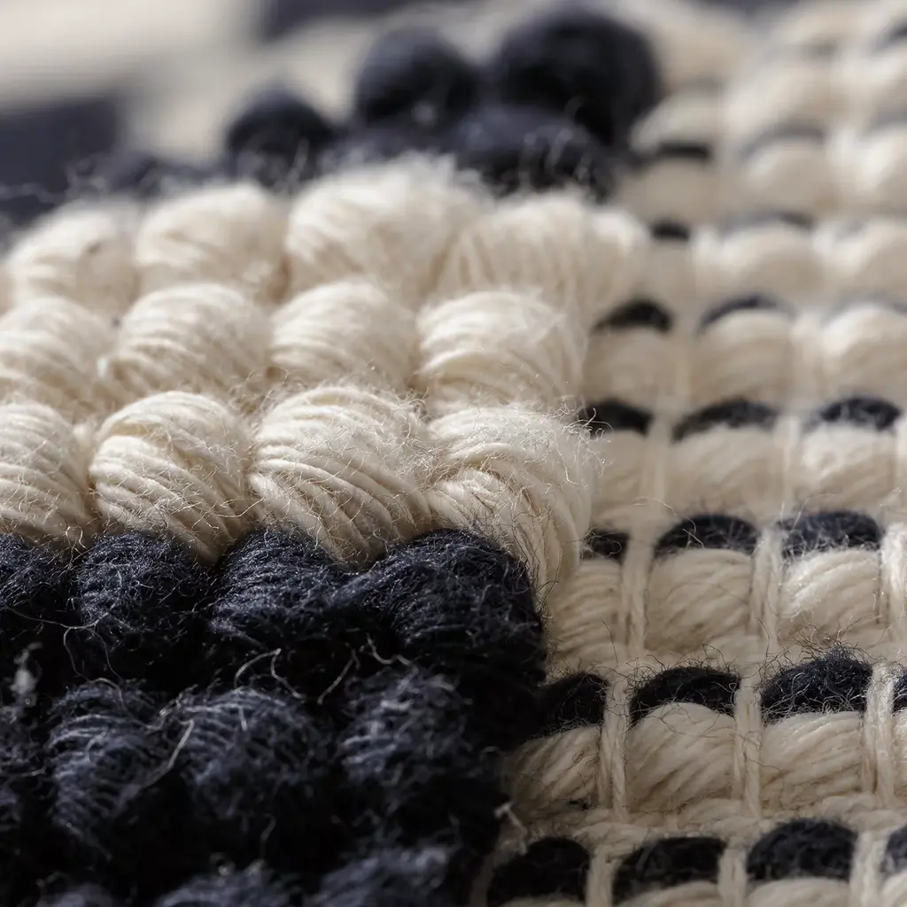 The outstanding feature of this fine artisan cushion is the pleasant texture of grape-like stitches characterizing its cotton weft. This superb effect is obtained by deftly following the "pibiones" (the Sardinian word for grapes) method, an ancient local technique of weaving that also imbues the piece with a precious cultural value. A horizontal motif of black squares adorns the center, emerging from a sober, ecru-toned backdrop.