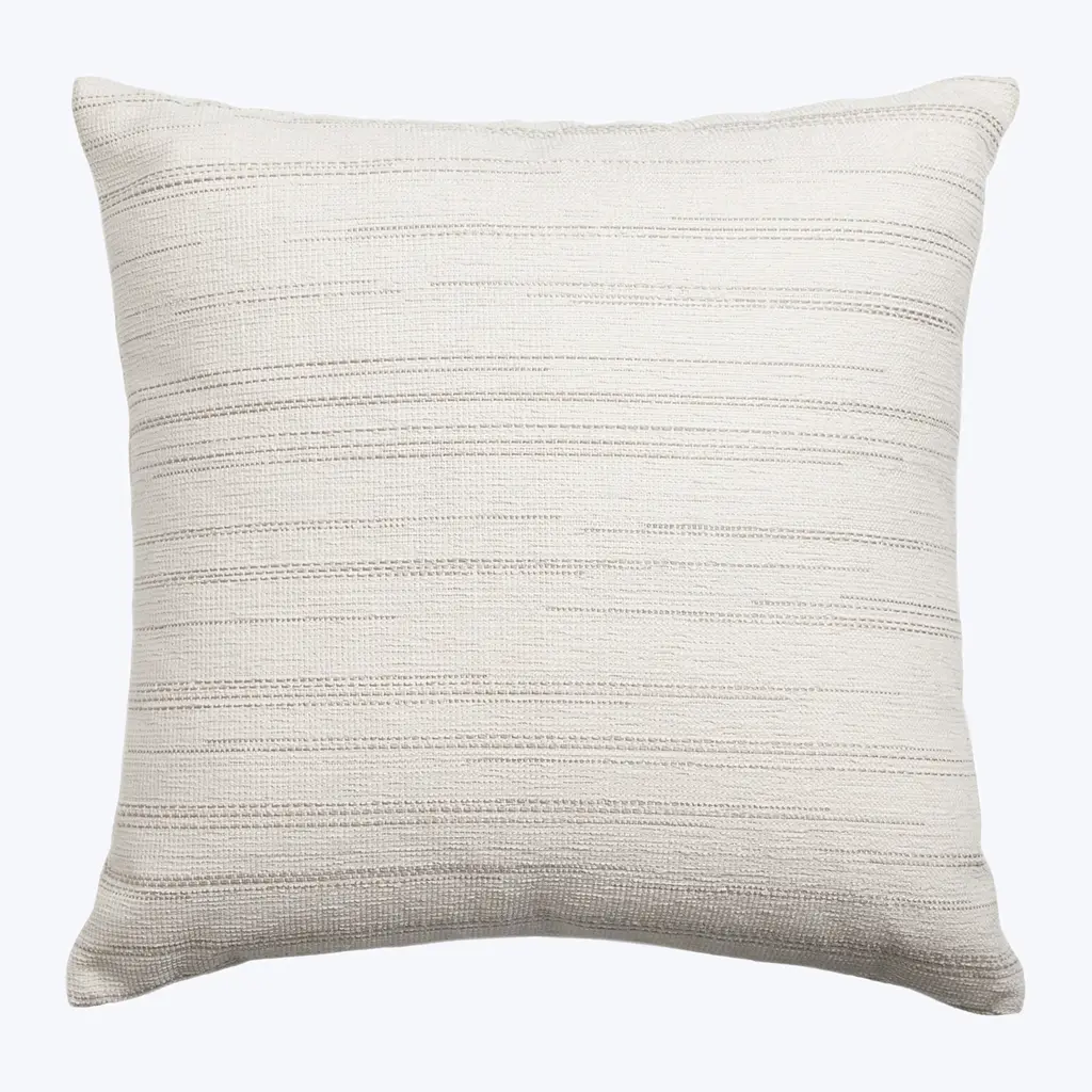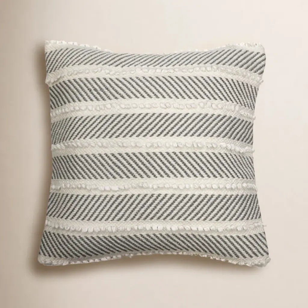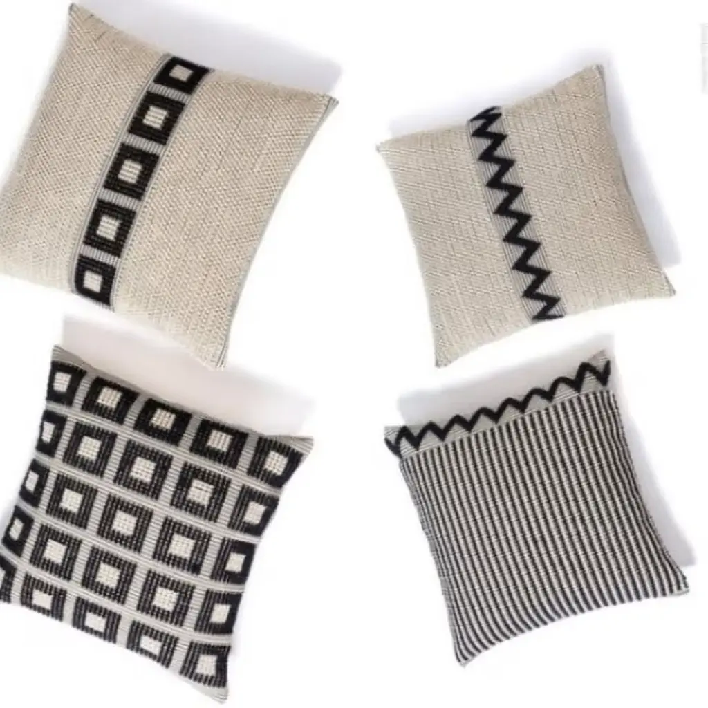 The outstanding feature of this fine artisan cushion is the pleasant texture of grape-like stitches characterizing its cotton weft. This superb effect is obtained by deftly following the "pibiones" (the Sardinian word for grapes) method, an ancient local technique of weaving that also imbues the piece with a precious cultural value. A horizontal motif of black squares adorns the center, emerging from a sober, ecru-toned backdrop.