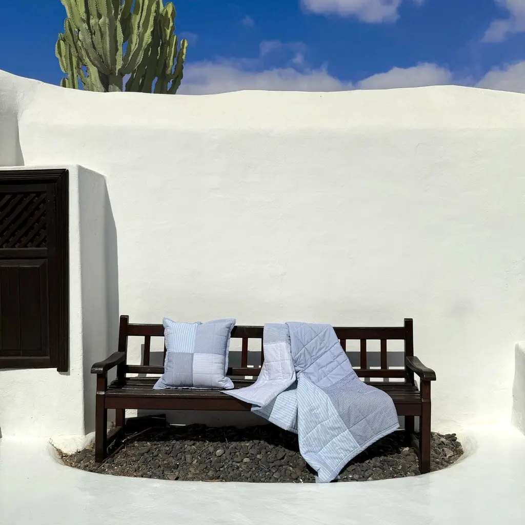This quilted patchwork pillow cover features a medley of blues – from soft sky to deep denim.Each padded panel is woven with unique striped patterns that feel sweetly familiar and timeless.Made from high quality cotton remanent fabrics, it’s the perfect accent piece to your summer bed, lounging areas or outdoors excursions