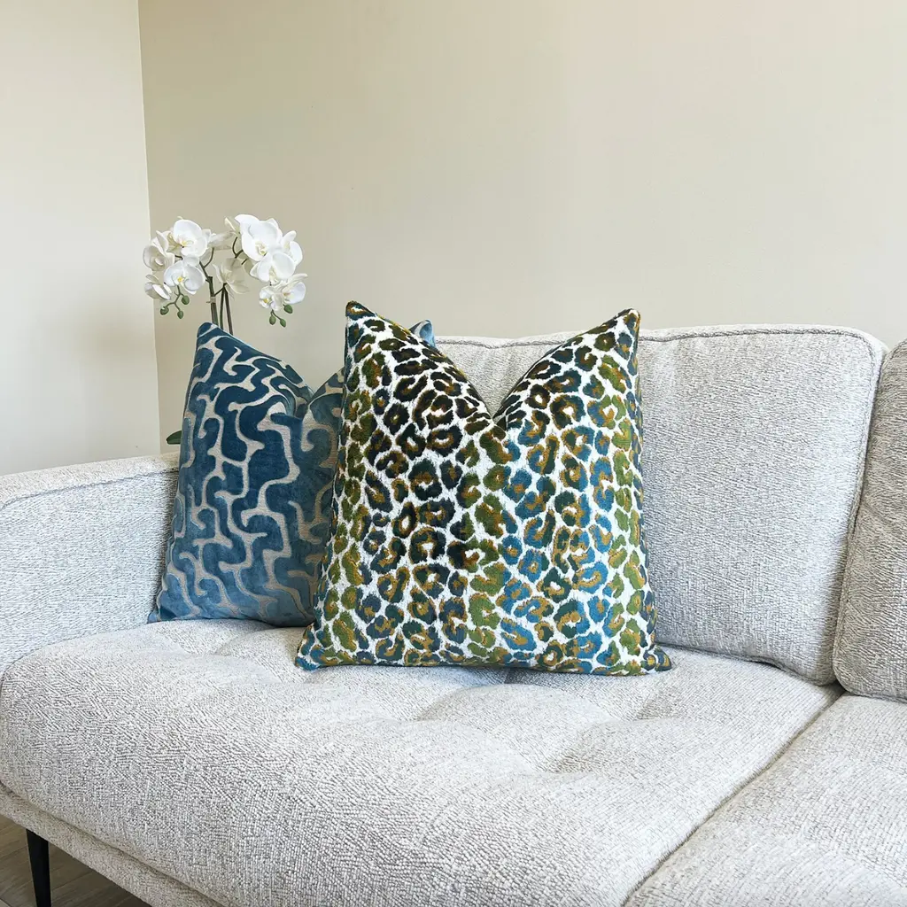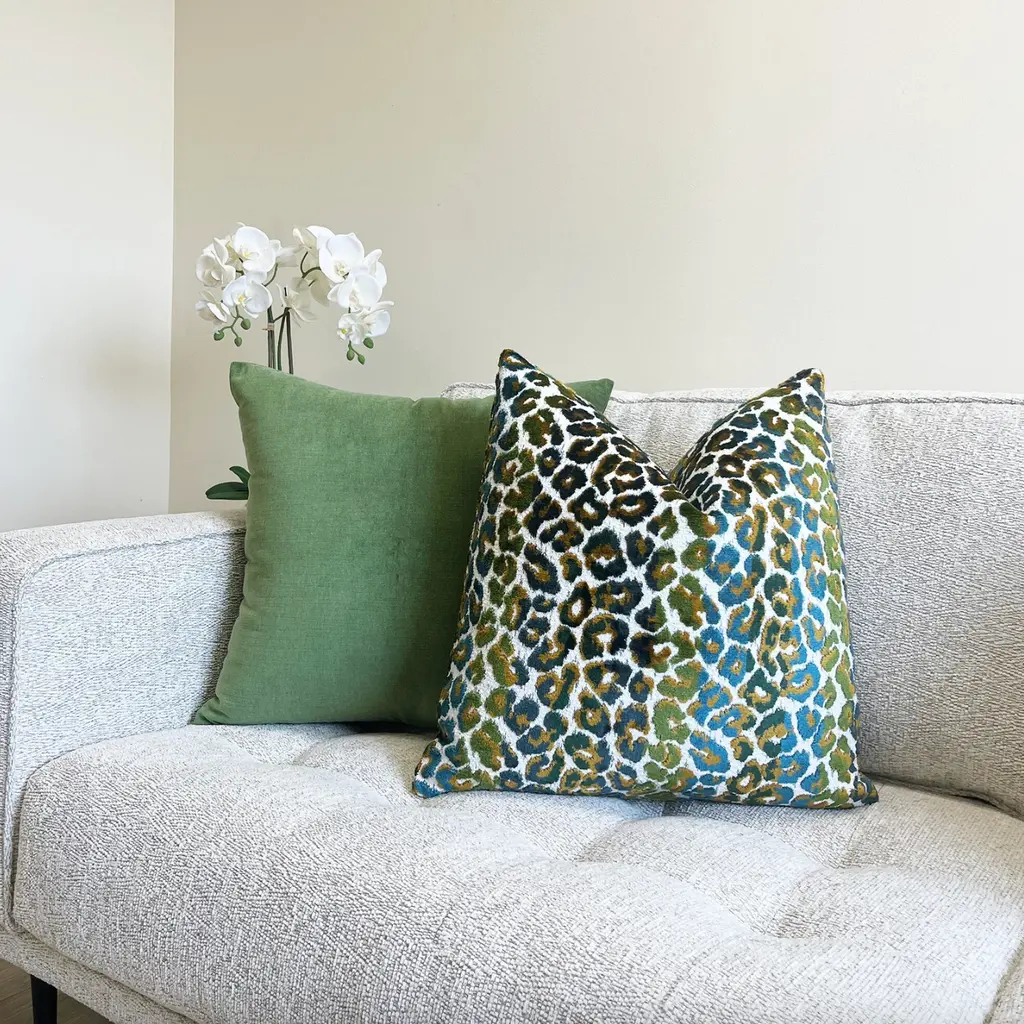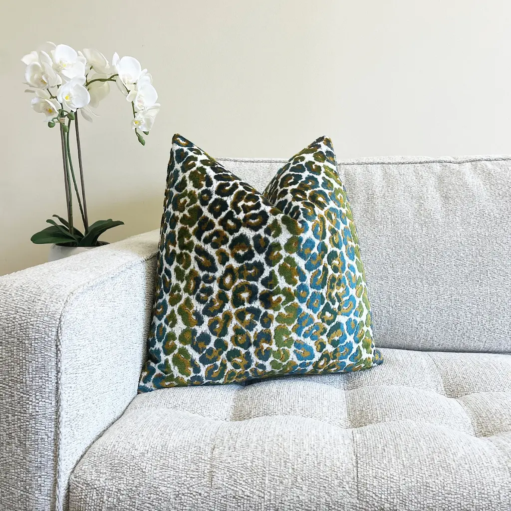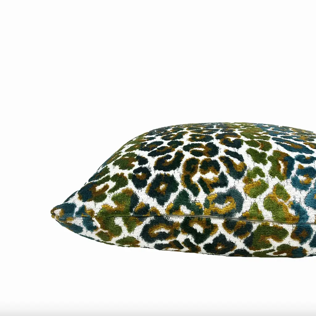 This throw pillow will add so much depth and texture to your space. It has a beautiful and rich color palette of bright green, dark green, teal, and gold. The texture of the fabric is elegant and complex. It's a cut velvet of multicolored leopard spots in a stripe pattern on a white chenille background. It's vibrant and super luxurious. It's the perfect decorative pillow cover to add color and style to a room. Mix and match it with one of our solid velvet pillow covers for a rich finished look. This decorative pillow cover is made of high quality designer fabric and is handcrafted with care for a luxurious look and feel. Our pillow covers are tapered at the corners to avoid pointy dog ears. When stuff they will be perfectly square. Handcrafted in the US. This pillow comes stuffed with a Feather down insert - please contact vendor if you'd prefer a Down alternative insert instead. Fabric: Velvet Stuffing: 95/5 Feather Down Insert Care: Dry Clean Closure: Nylon zipper closure Made to order Will ship within 5 business days