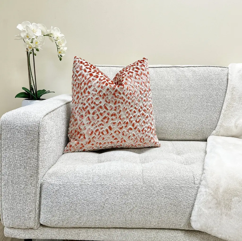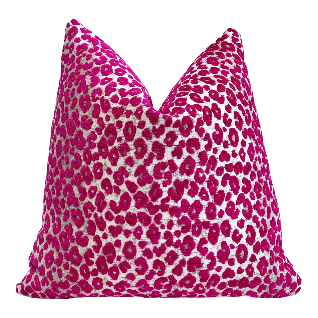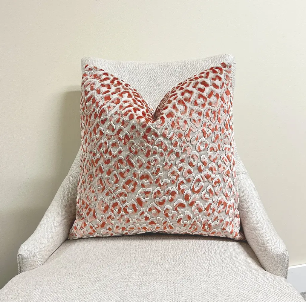 This gorgeous raspberry blush and cream leopard animal print pillow will set your room apart. The pattern is a raised textured leopard on a cream background. It has just the right touch of sheen to make the pattern stand out. The color combination of raspberry blush and peach is colorful and sophisticated. This pillow cover will add a touch of elegance and style to your home. Mix and match with other patterns to create an interesting pillow scape. Our pillow covers are tapered at the corners to avoid pointy dog ears. When stuffed, they will be perfectly square. This pillow comes stuffed with a Feather down insert. Fabric: Velvet Stuffing: 95/5 Feather Down Insert Care: Dry Clean Closure: Nylon zipper closure Made to order Will ship within 5 business days