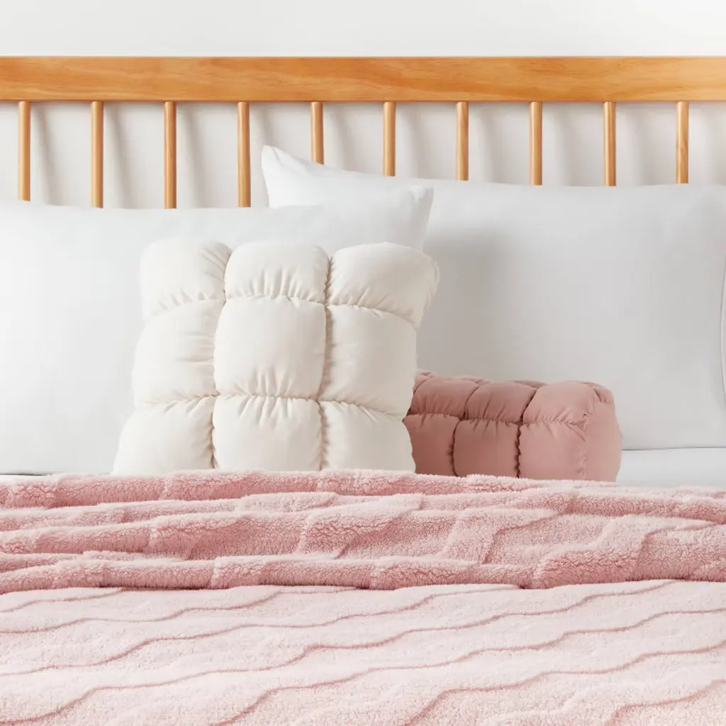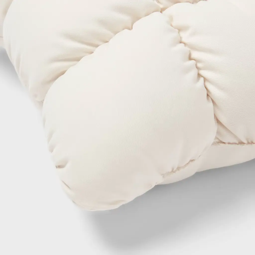 Add a soft splash of style to your decor with this Puffer Square Decorative Throw Pillow from Room Essentials™. Designed in a 16-inch square silhouette, this bolster throw pillow showcases a puffer construction in white for a tastefully textured aesthetic. Made of 100% recycled polyester microfiber with soft filling, this throw pillow is great for use anywhere inside your home.Room Essentials™: Everyday Value