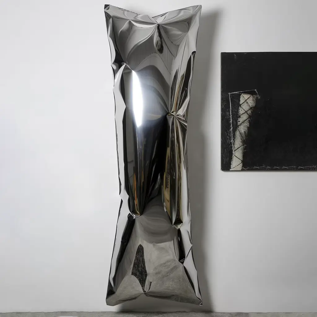 Fashioned of stainless less and boasting a glaring mirror finish, this wall sculpture was whimsically shaped like a plush cushion for accenting walls of contemporary interiors with a synthesis of playfulness and art. Stunning light reflections get favored by its combination of finish and crumpled aesthetic. Please explore the Artemest catalog for size and color variants.