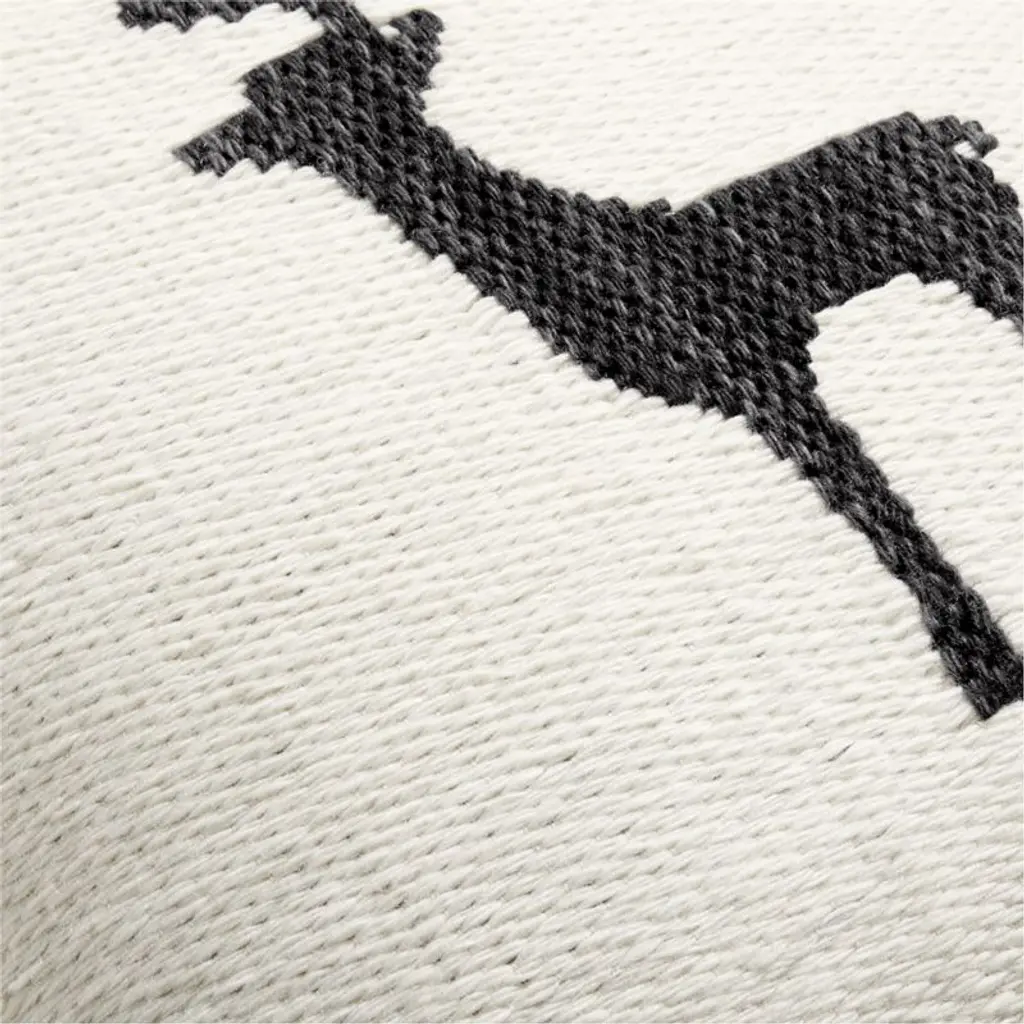 Cozy up your holiday decor with our ivory throw pillow focused on a single black silhouette of our signature reindeer. Featuring a kilim weavea tight interweaving of warp and weft strands often used to make carpetsthe square pillow highlights the angled shapes, heathered color and rustic texture characteristic of this celebrated weaving technique. Our exclusive pillows include your choice of a plush feather-down or lofty down-alternative insert.