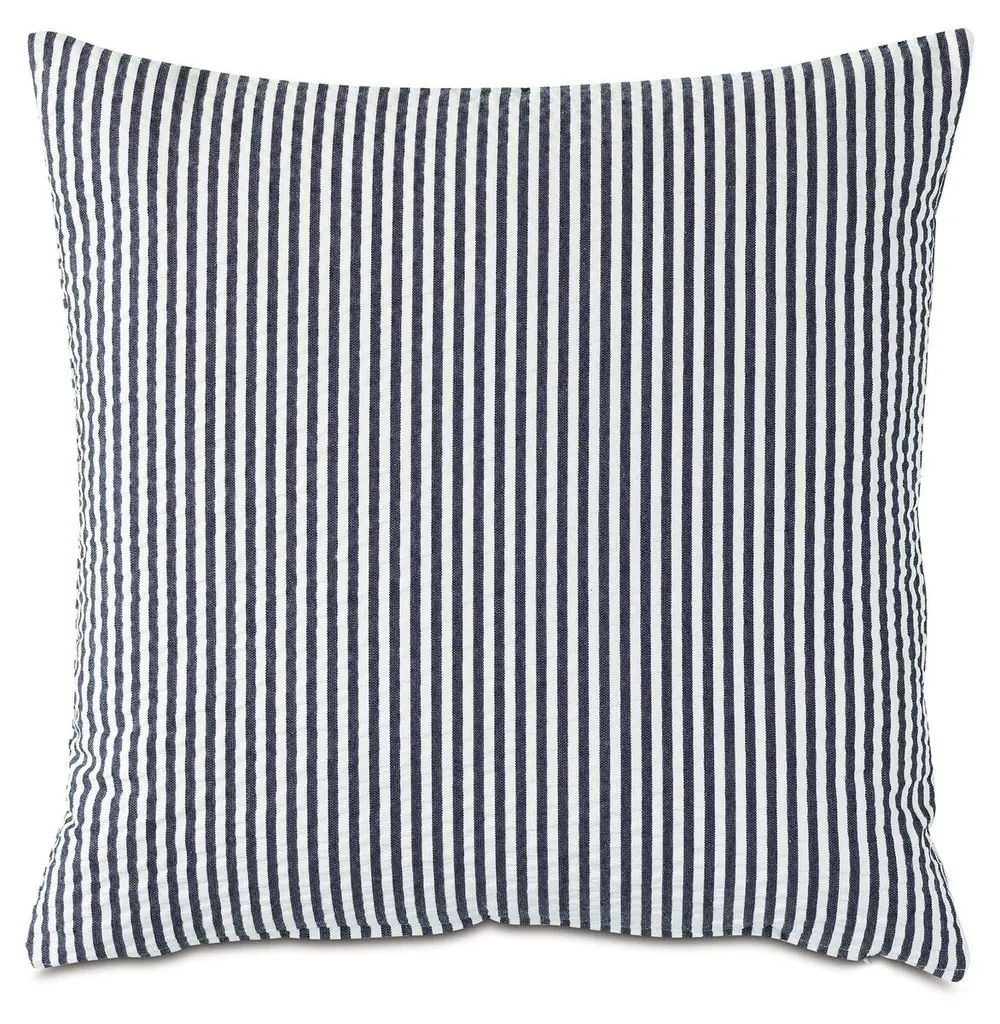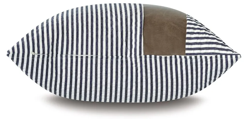 Exclusive to One Kings Lane: A leather appliqué on the front adds extra texture and sophistication to this navy-and-white striped pillow. The small-feather fill ensures luxe loftiness. Hidden zipper closure.