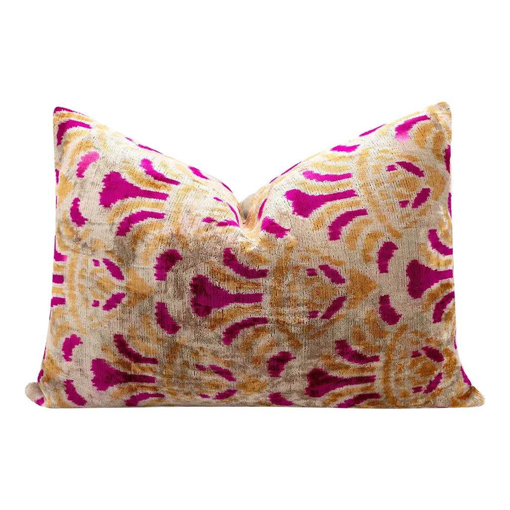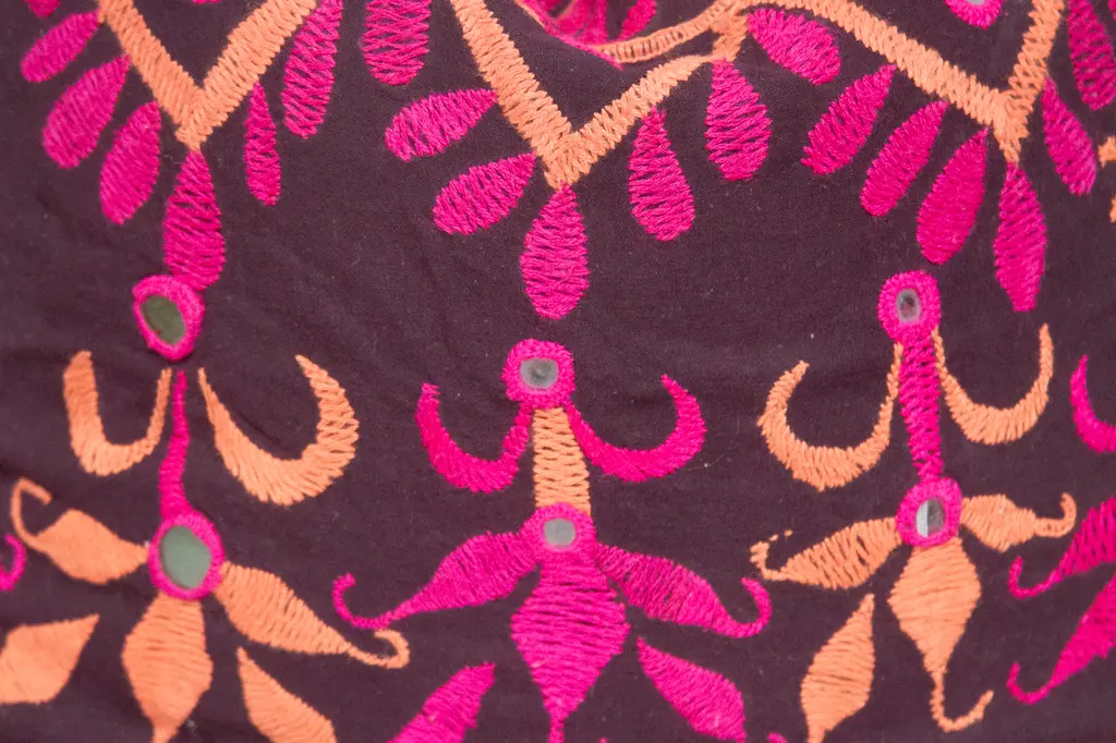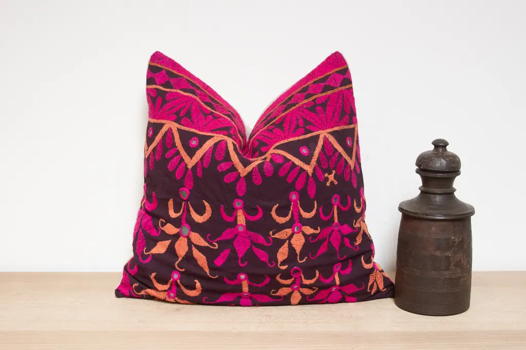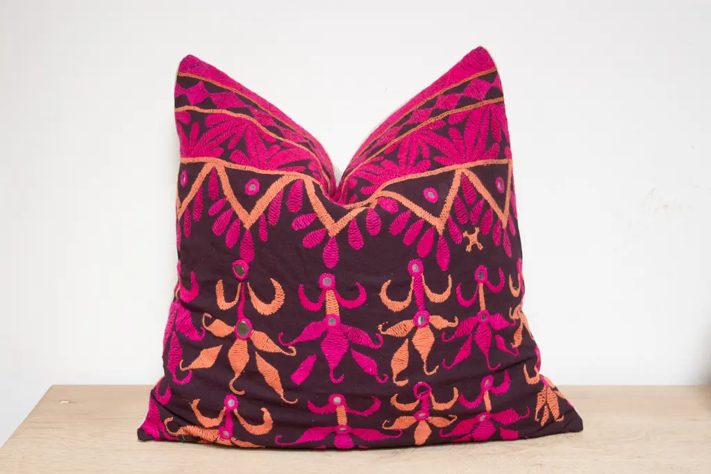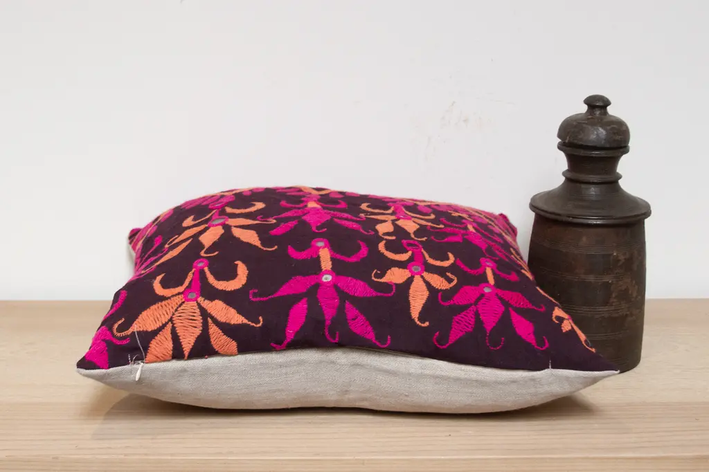 A lovely hand-embroidered pillow made from vibrant vintage tribal skirts coupled with a new linen back. This intricate floral embroidered cotton pillow is the perfect splash of color to add to any space. This throw pillow has a hidden zipper and comes filled with a down-blend insert. For care and maintenance, remove the insert and dry clean only.