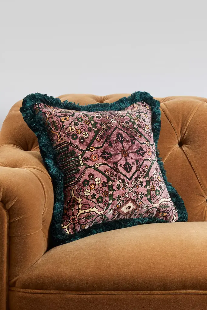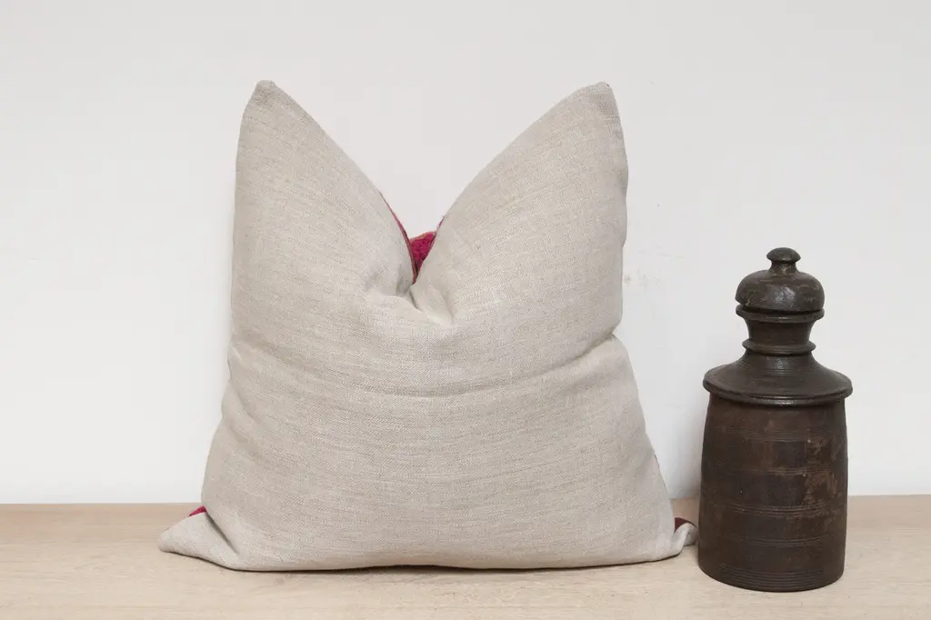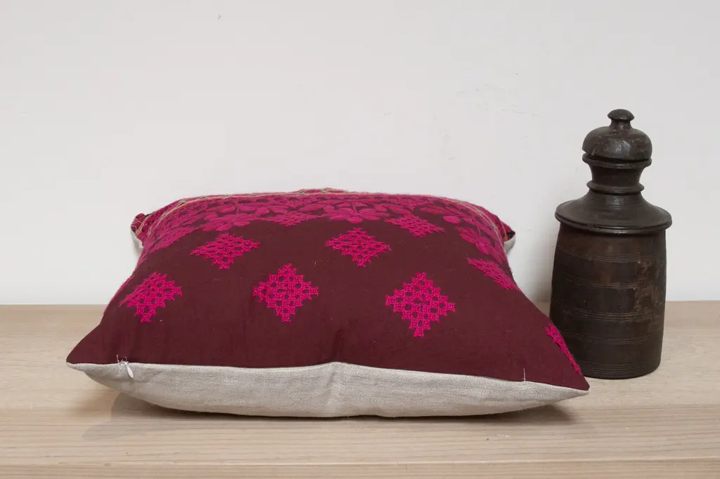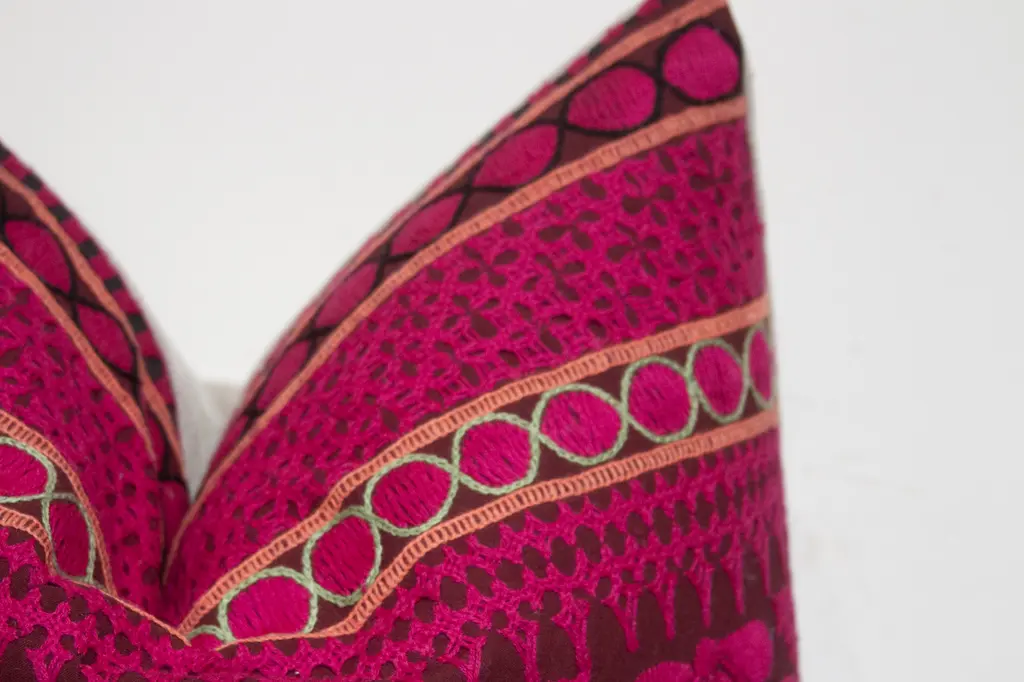 A lovely hand-embroidered pillow made from vibrant vintage tribal skirts coupled with a new linen back. This intricate lace-like and floral embroidered cotton pillow is the perfect splash of color to add to any space. This throw pillow has a hidden zipper and comes filled with a down-blend insert. For care and maintenance, remove the insert and dry clean only.