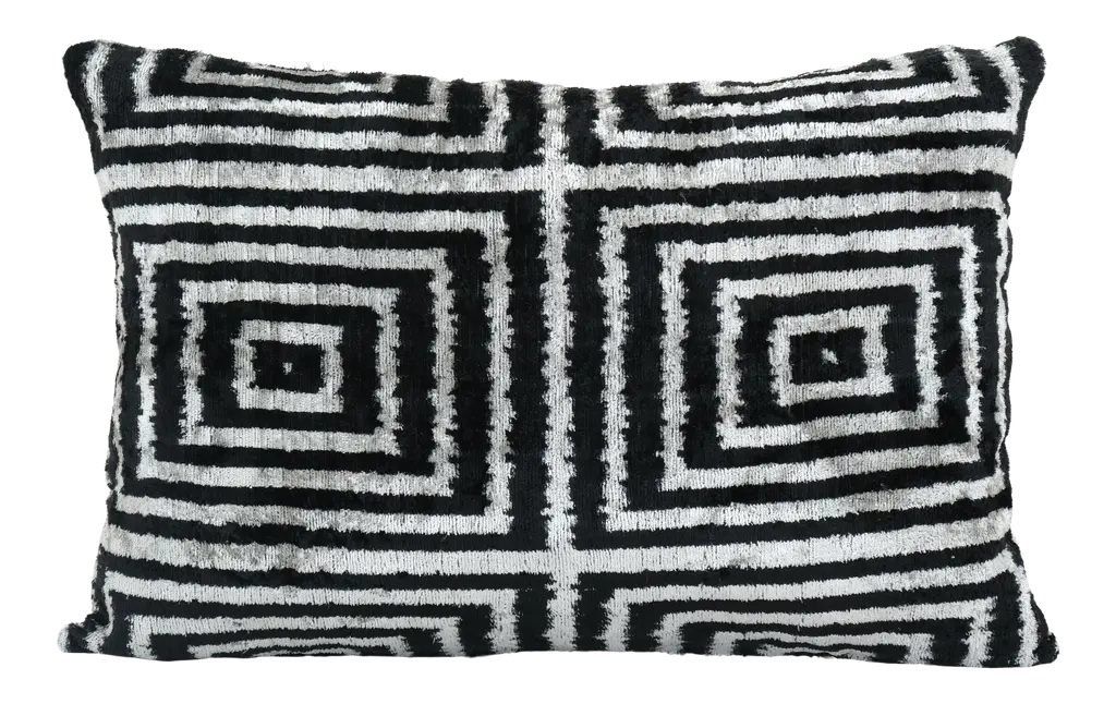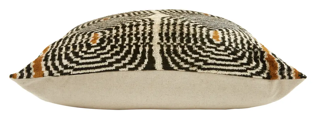 Bring a global-chic vibe to your sofa or bed with our hypnotic Roan Ikat Pillow. Made from super-soft silk velvet, Roan is crafted using traditional ikat techniques — a centuries-old resist-dyeing process that originated in Central Asia. In this method, threads are wrapped around a frame and individually tied off with pigment-resistant palm fibers before dyeing and weaving. With each dye color, fibers are added or removed to create colorful and uniquely intricate pattern. Roan features a mesmerizing motif made up of concentric circles in shades of black, cream and warm caramel. Perfect as a layer in modern and boho spaces alike, we love Roan on its own or mixed in with other pillows in a similar palette. •silk velvet •backed in neutral linen fabric •knife edges •hidden zipper closure •down and feather insert •each is unique Dimensions •approximately 24" x 24"