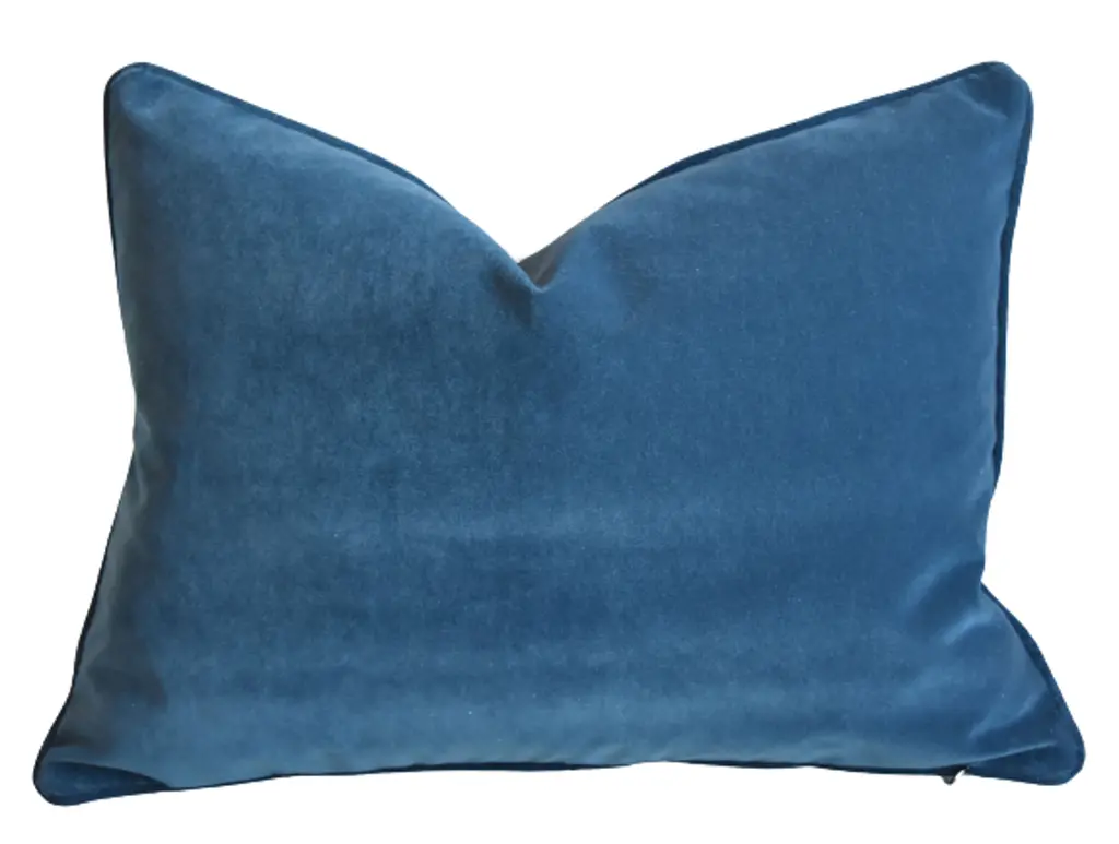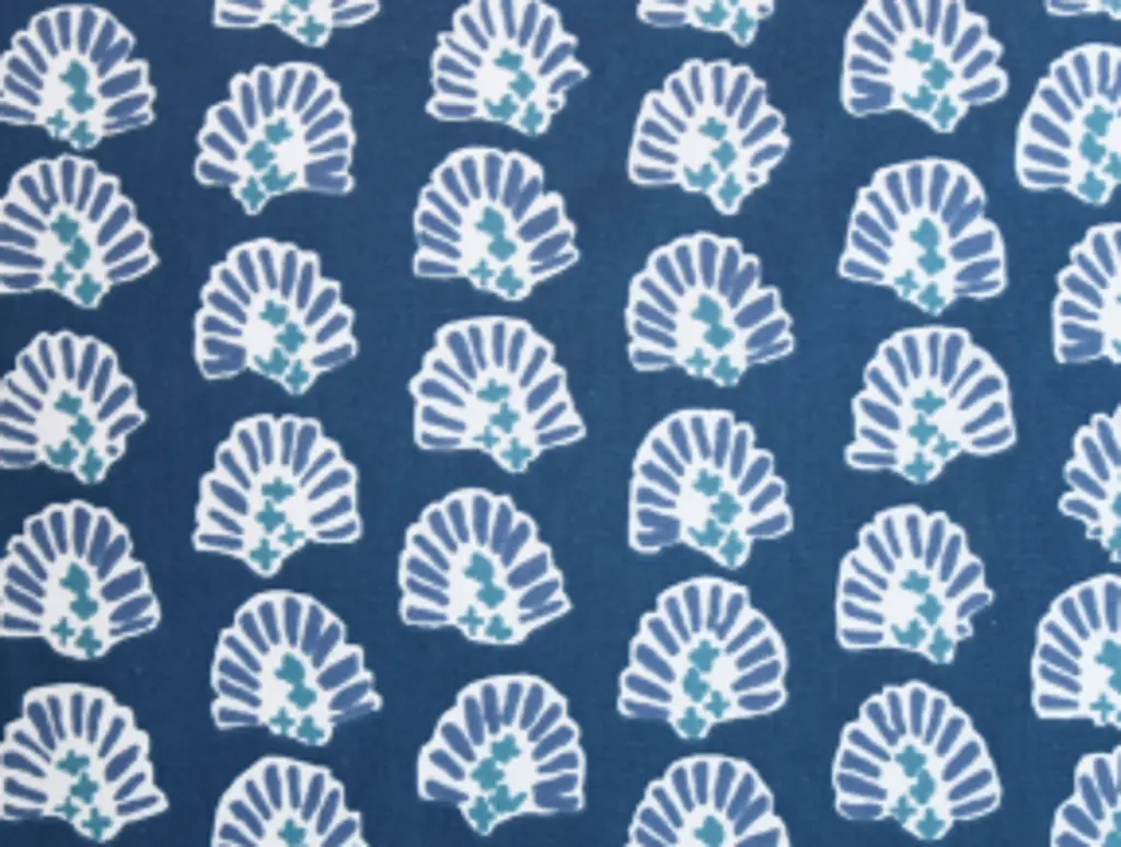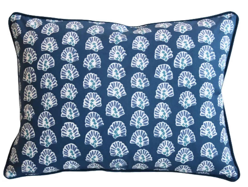 Custom-tailored pillow in Designer Robert Allen "Kola Stencile Lapis" cotton fabric depicting a beautiful beachy coastal nautical design. Blue cotton-velvet fabric back. Custom blue cotton cord trim. Zipper closure. Plump goose down-and-feather insert. Excellent new unused condition.