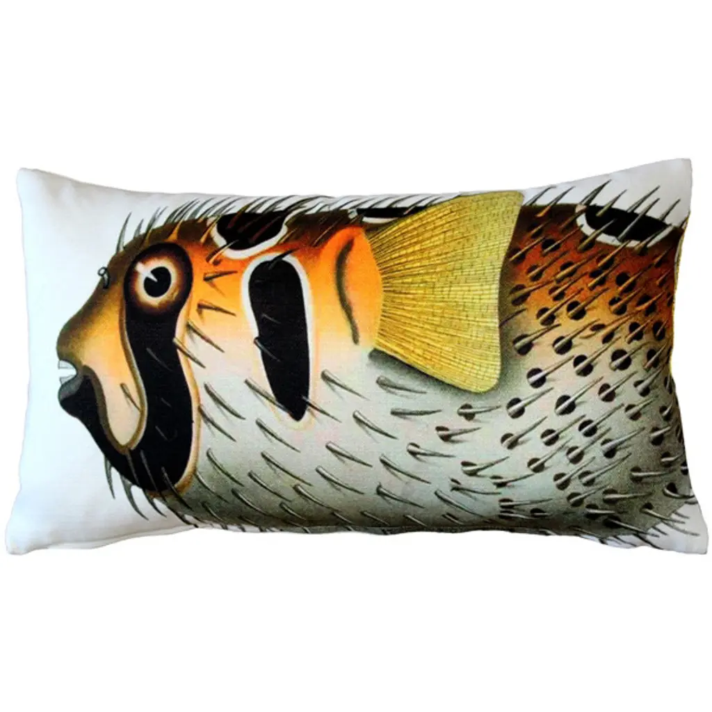 This double sided Rockfish decorative pillow is printed on both sides with the head and body of the fish on the front and the tail on the back. Printed on an indoor outdoor spun polyester fabric. Size: 12"x19" Rectangular Fabric: 100% Polyester Fish head and body on front, tail and body on back Color matched zipper closure Hand wash cold separately Made in Canada: Designed and made in Pillow Decor's Vancouver workroom.