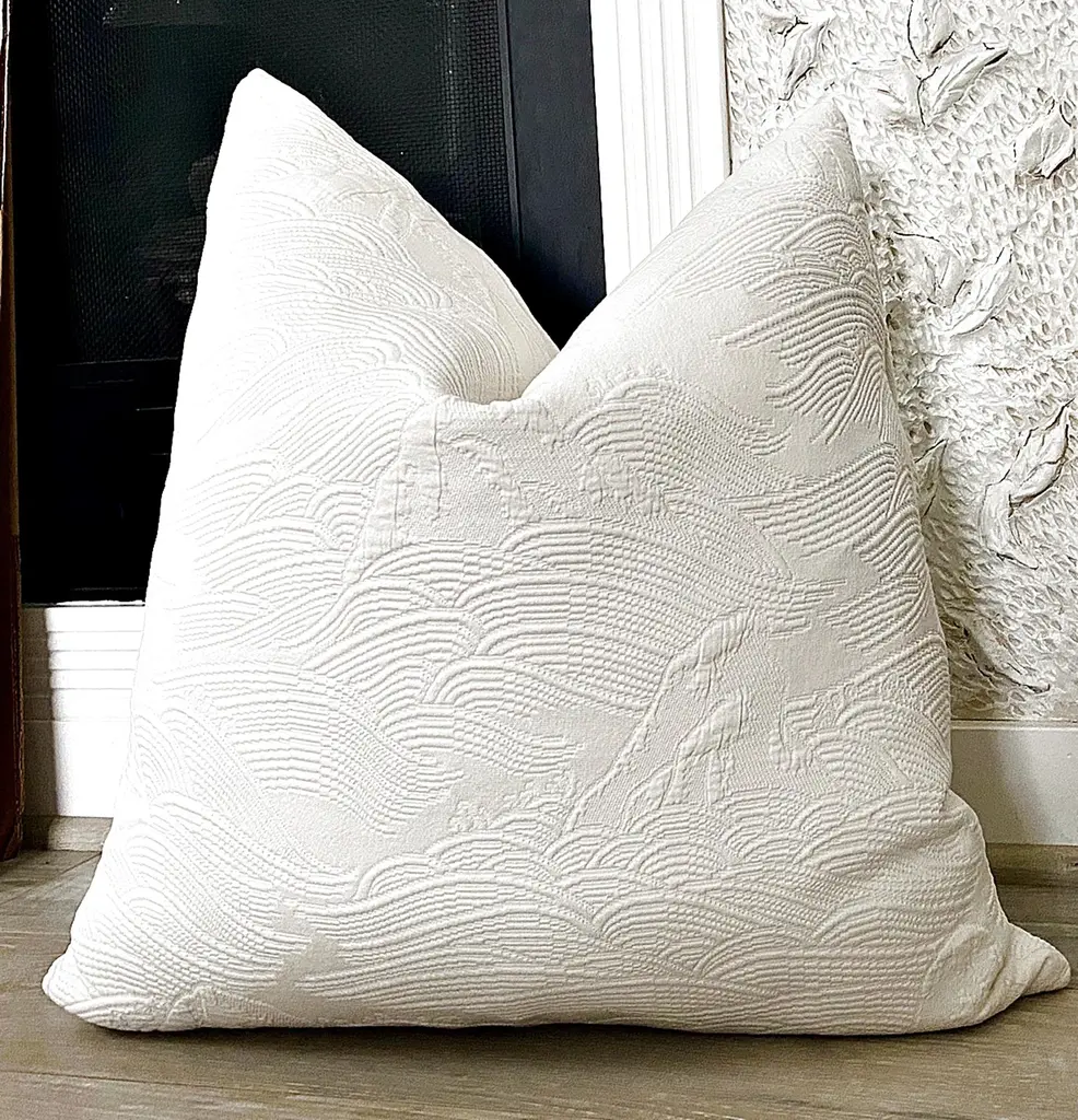 Add a pop of white with this classic rolling hills Asian Chinoiserie pattern. Made of a soft 100% Italian cotton matelasse fabric in a ivory color. This versatile fabric works well with prints or solids and will add a pop to bright colors and accented muted shades. As comfy as it is pretty! *Two sided with the same Italian cotton matelassae fabric on both sides. *Constructed with tapered corners, surged interior seams, and hidden zipper closure. *Dry Clean